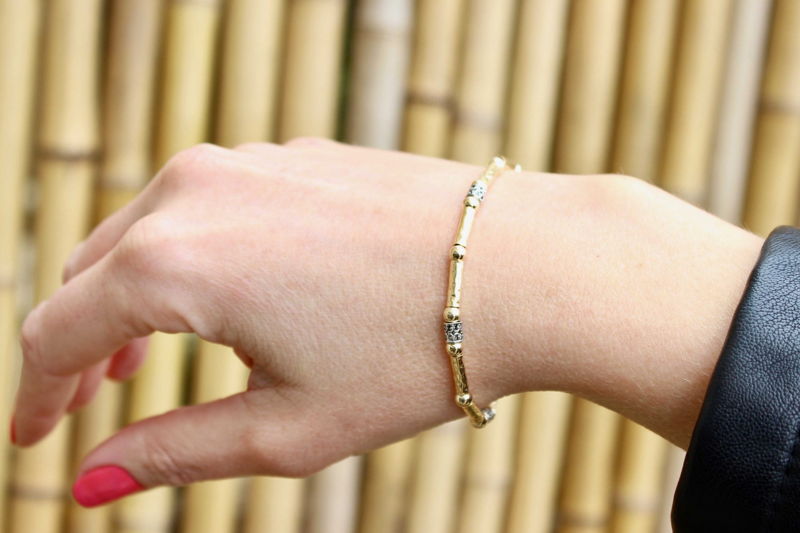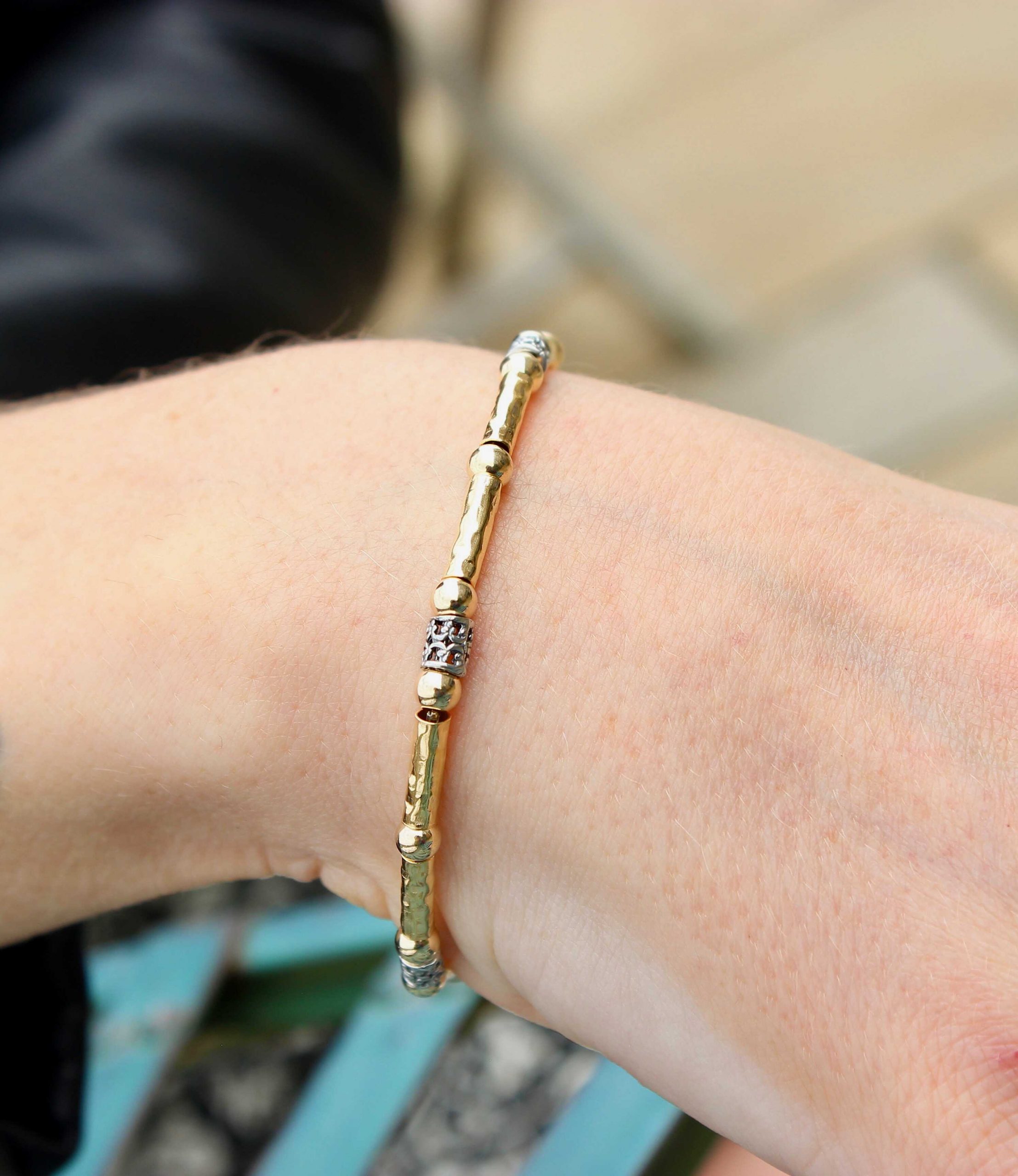 This hammered link bracelet is crafted from oxidised silver, 14ct red gold-filled tubes and yellow beads. Whether it’s a gift for a loved one or a treat for yourself, you just can’t go wrong with this beautiful piece.