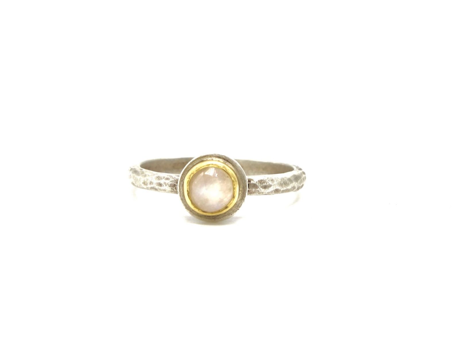 This ring features a pretty moonstone gemstone in a gold setting, with a hammered solid sterling silver band that gives it a fab and unusual textured appearance. The moonstone has an irredescence to it and shimmers in the light.