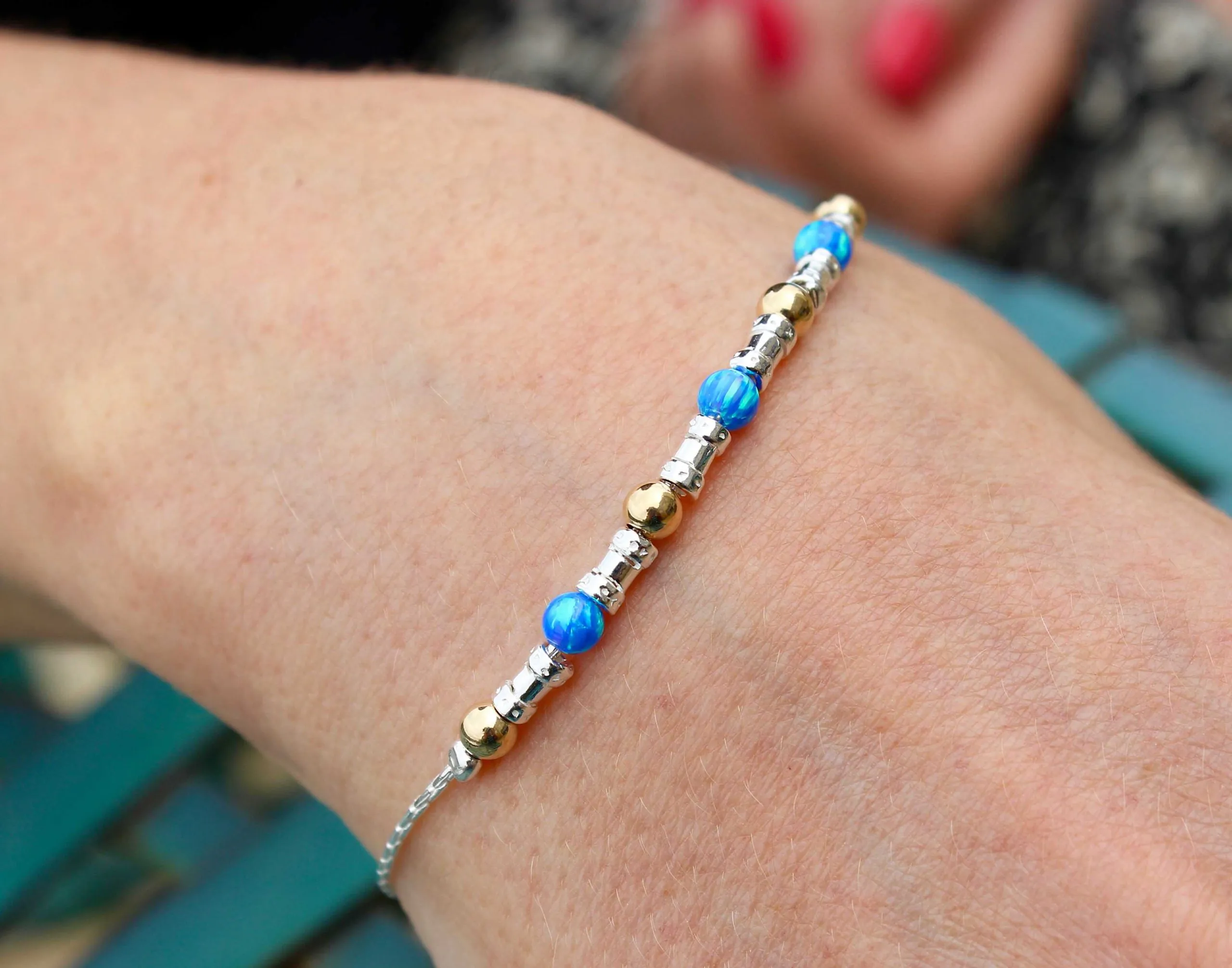 Sterling Silver Bracelet with 14ct Gold filled beads and 4mm Dark Blue Opals.