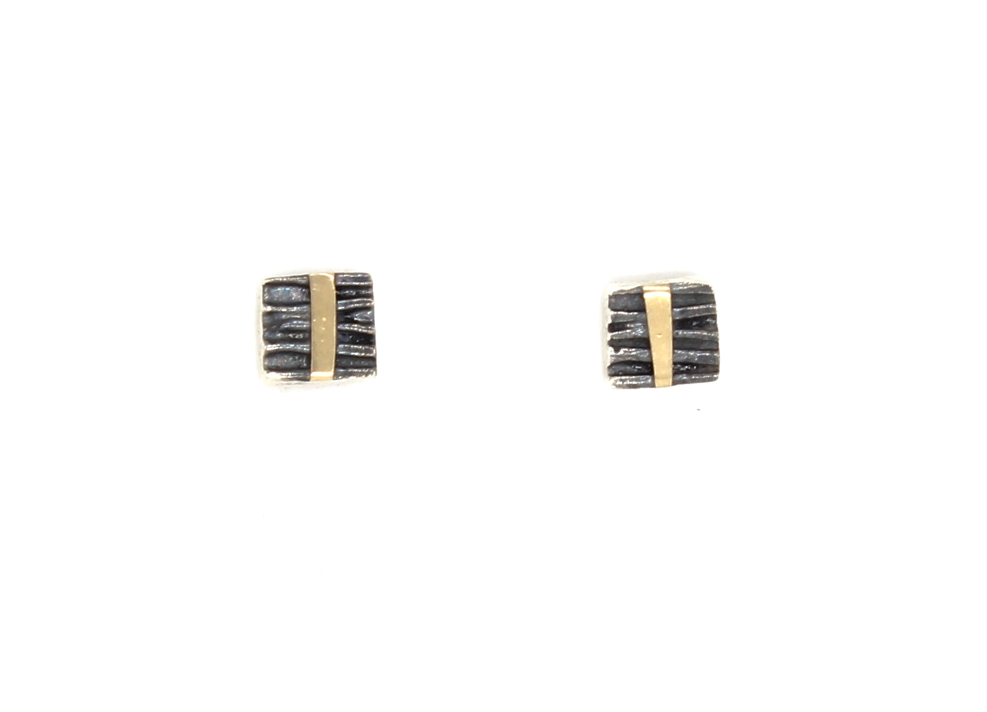 Sterling silver and solid gold earrings. The oxidised sterling silver contrasts brilliantly with the 18ct gold centre to create a cute pair of earrings, full of texture. Matching necklace with silver and gold pendant available here!