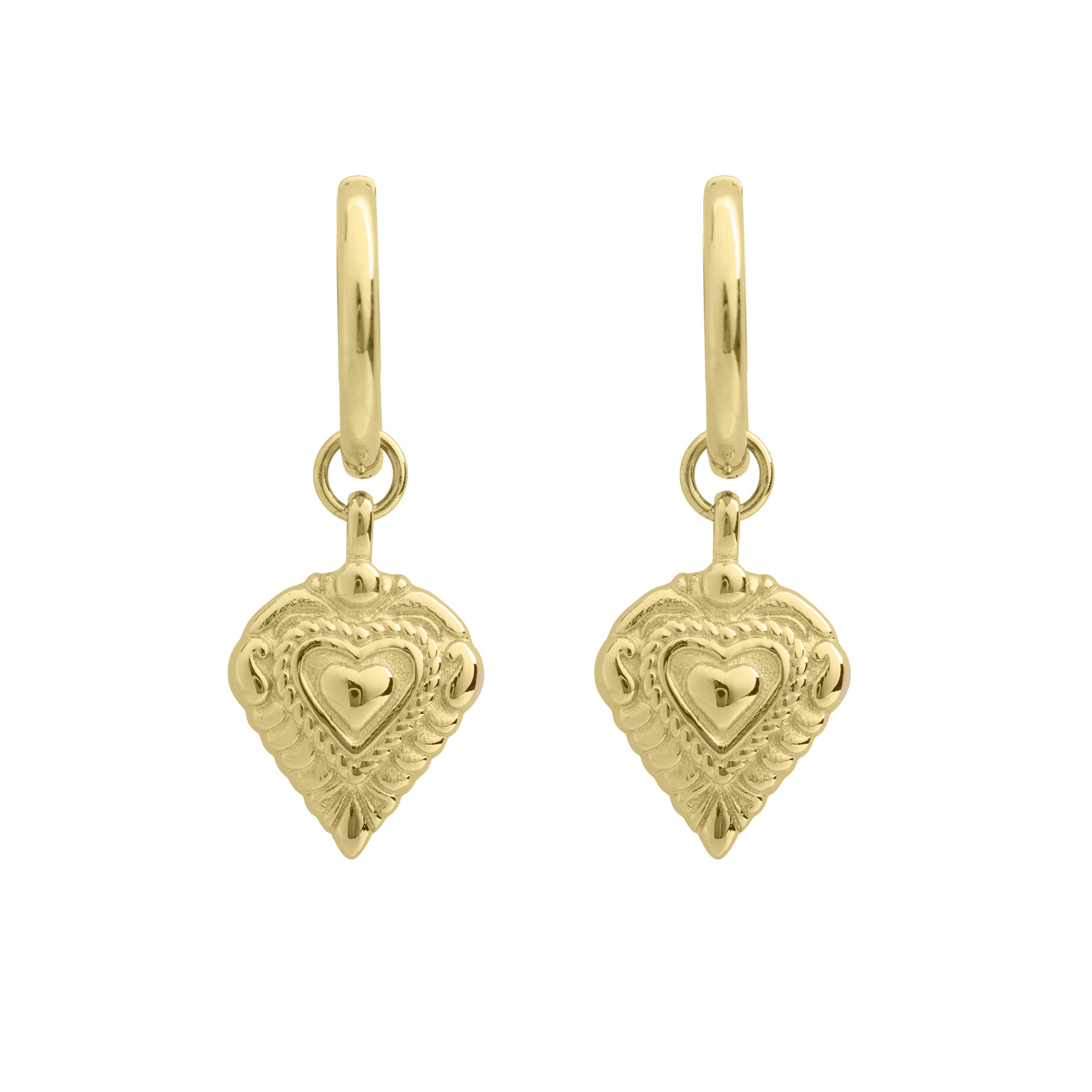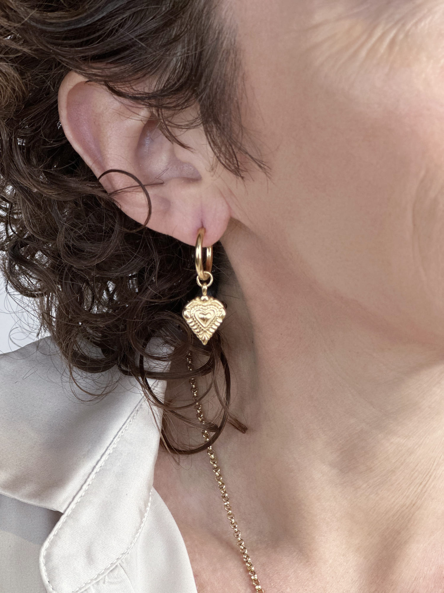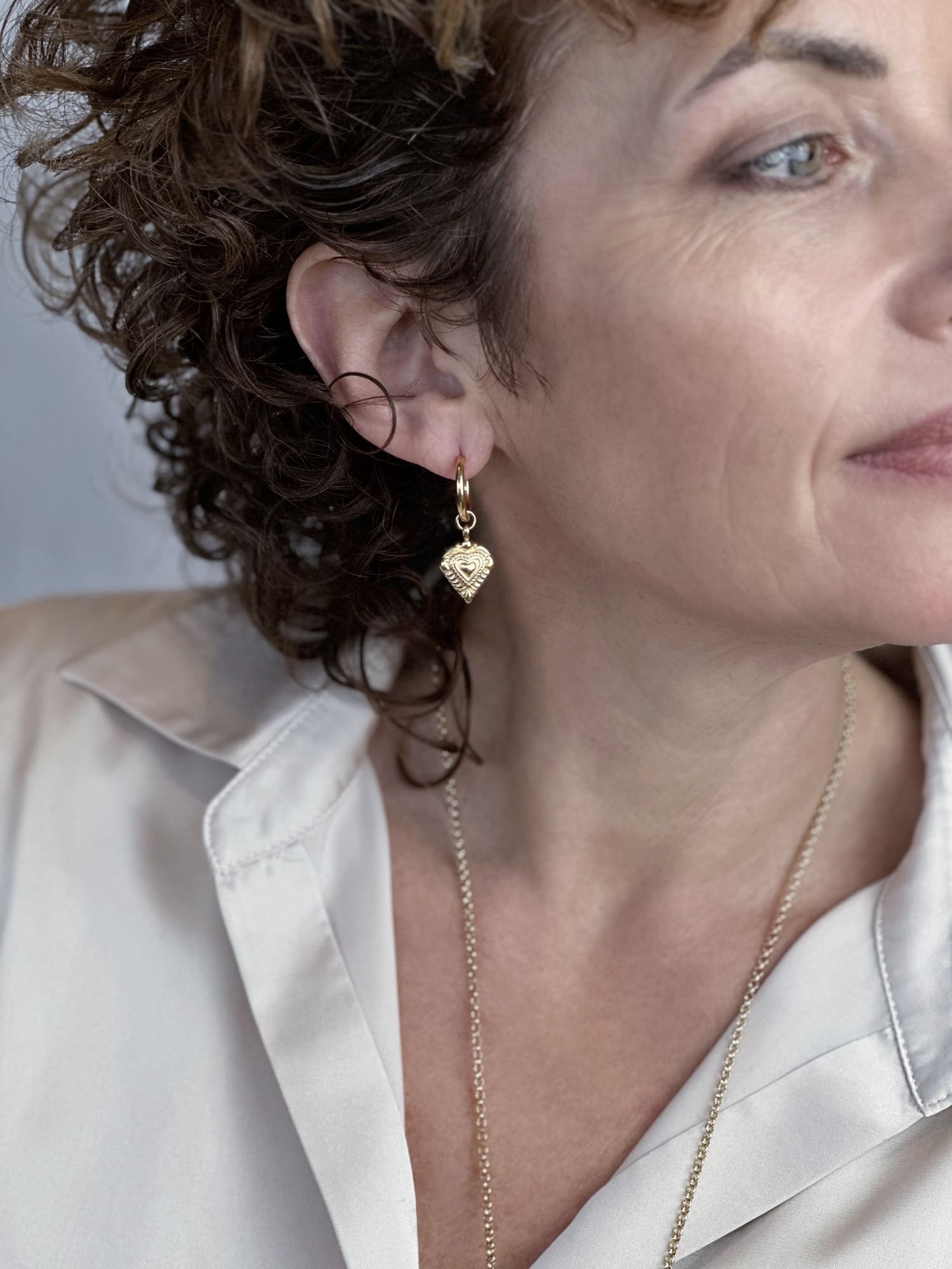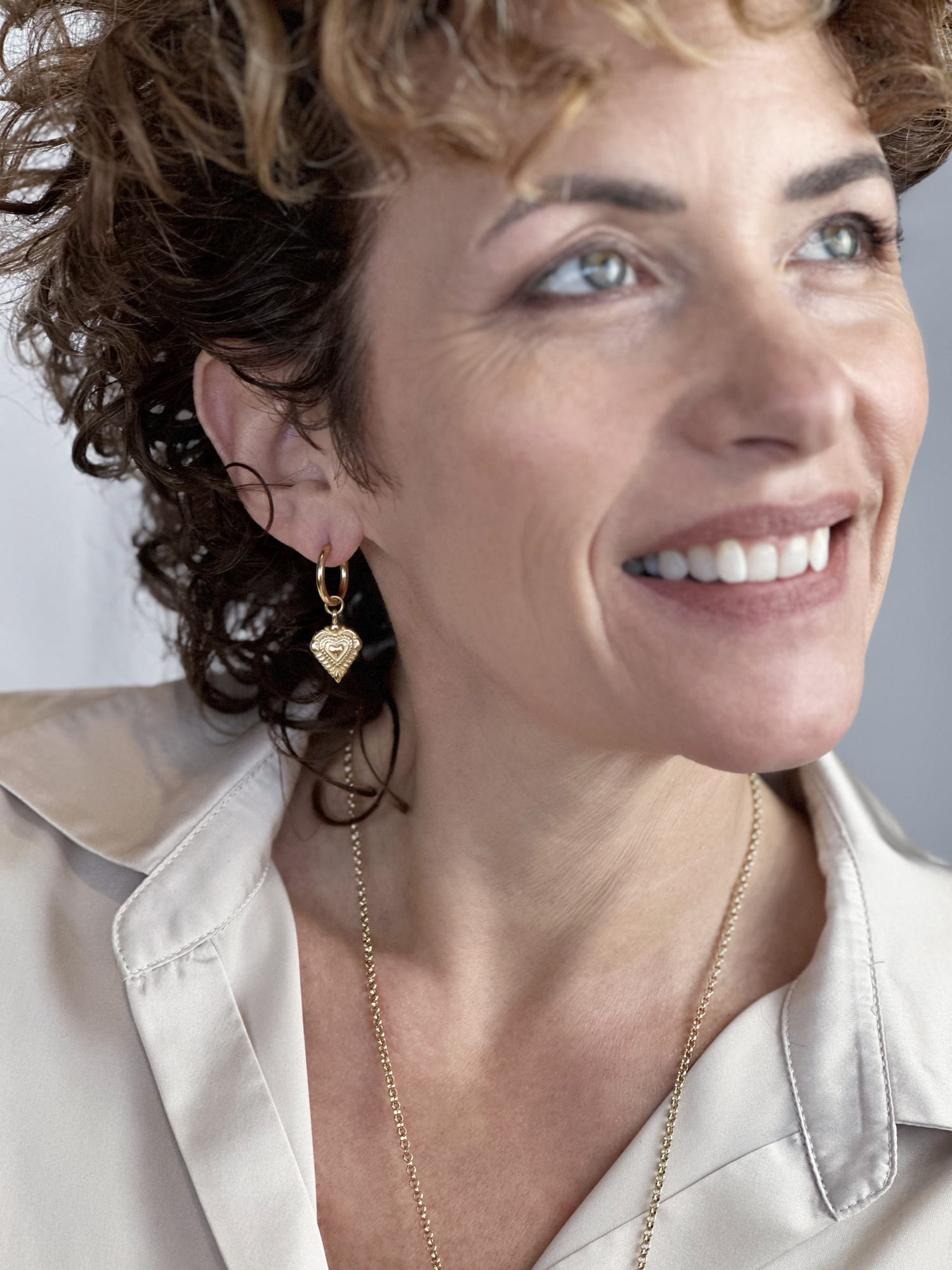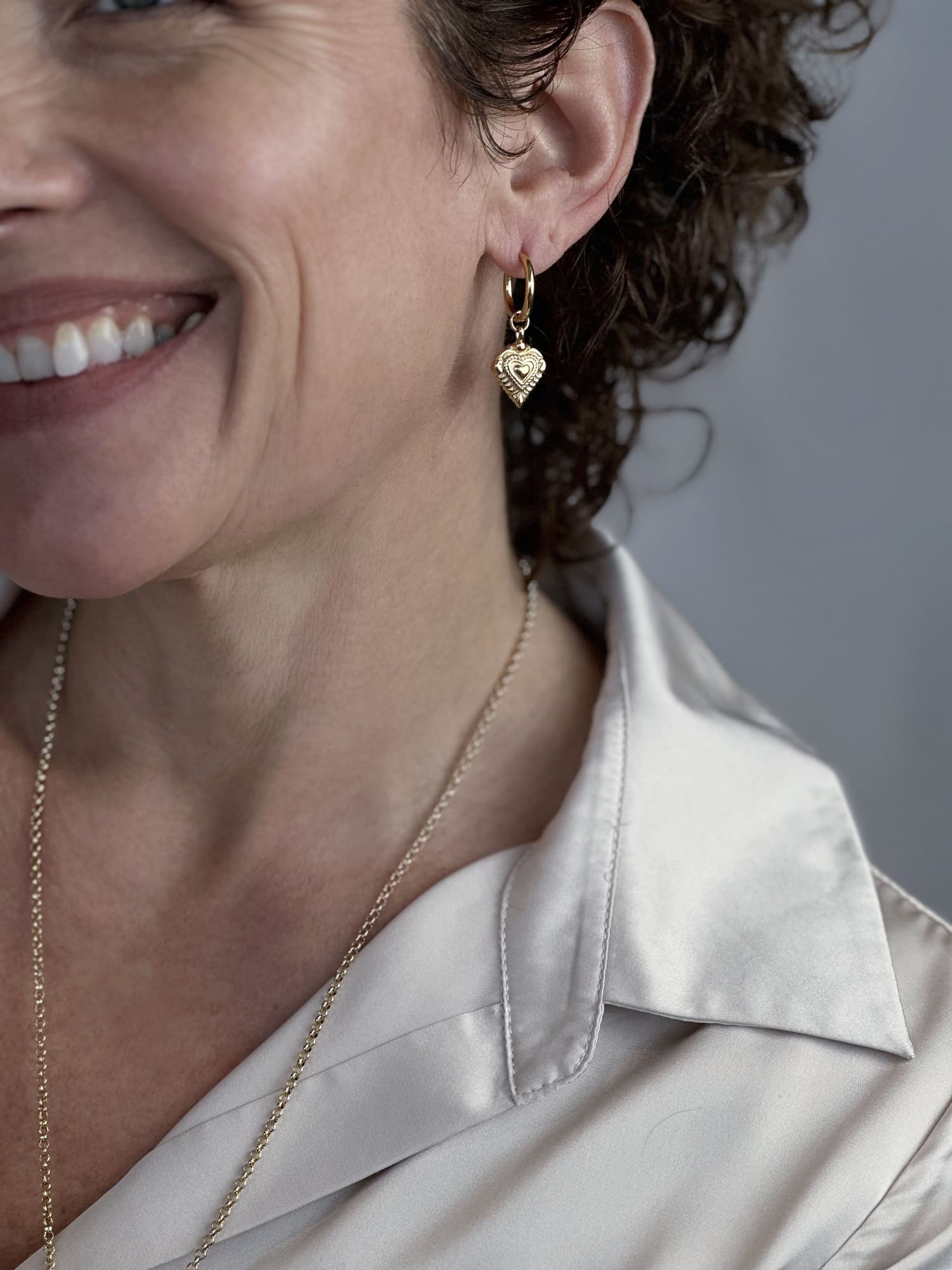 A romantic finishing touch to your everyday look. The Halo Heart Huggies feature our signature textured heart charm, delicately detailed with a raised centre heart for added depth and shine. Suspended from sleek gold huggie hoops, they’re lightweight, timeless, and designed to perfectly match our Halo Heart Necklace.