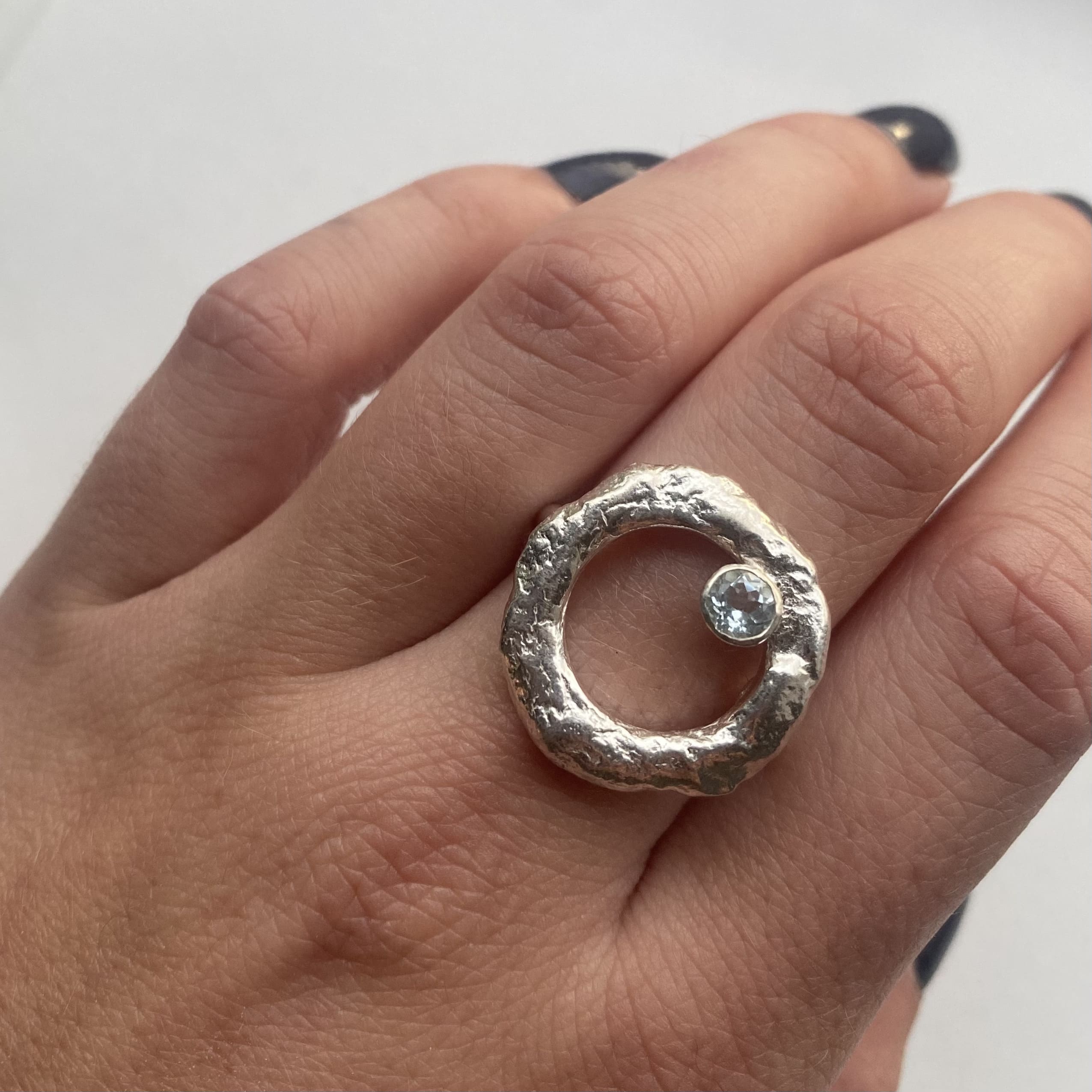 A beautiful Aquamrine cradled in silver, sits at 1 o’clock on its halo set on a slightly hammered shank.  Truly organic this creation is made by a fab British Designer in her studio in North Cornwall, every ring is unique and so special you will love to have this adorning your finger, causing many an admiring glance. The perfect ring for a special occasion or just because, alternatively why not buy for a loved one or friend.