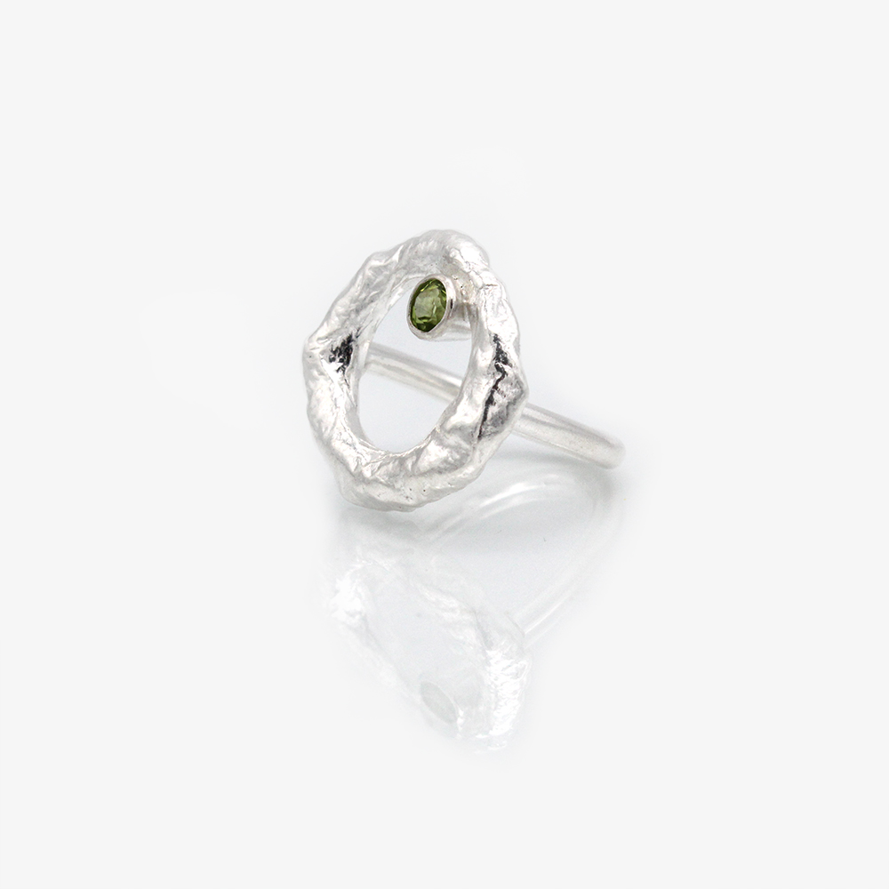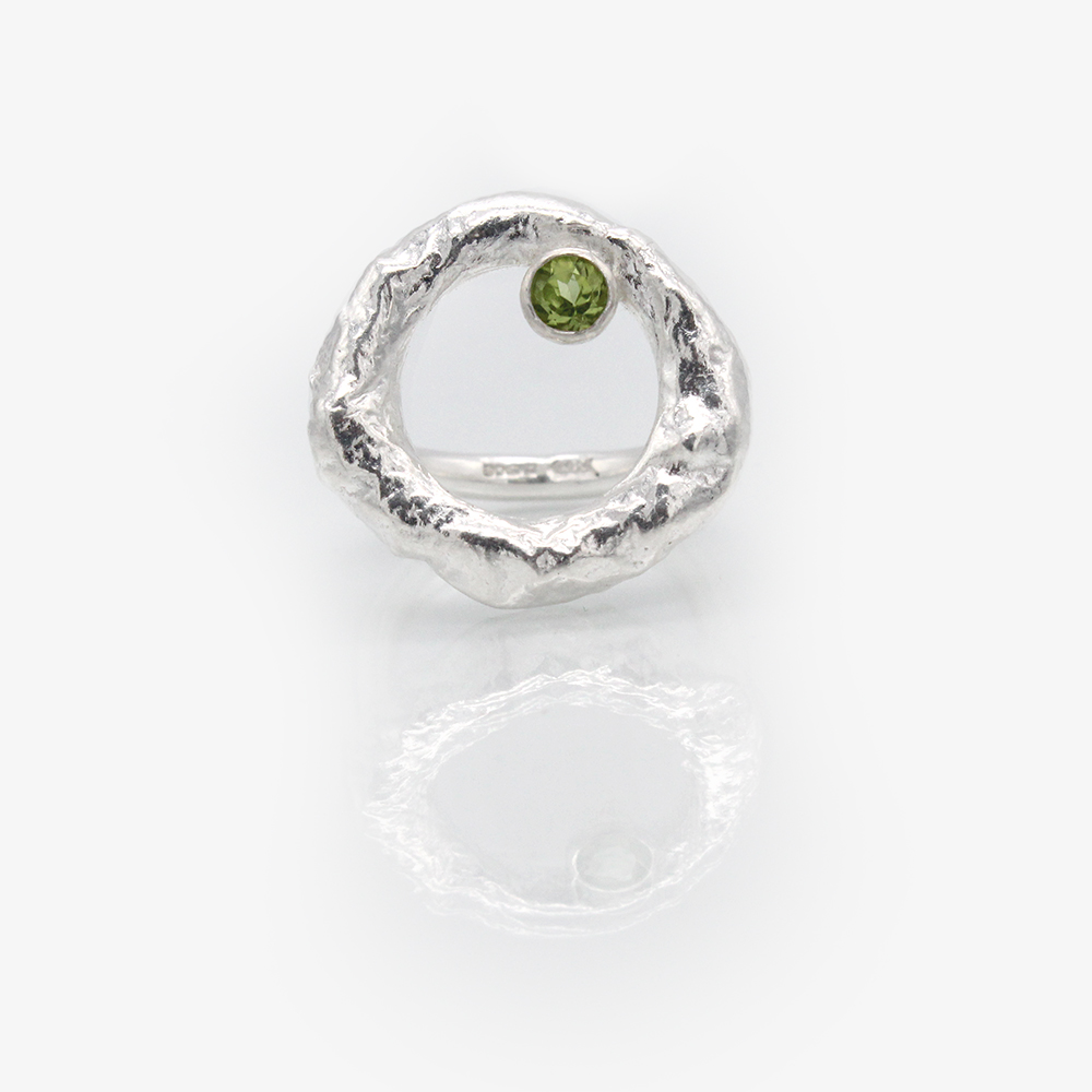 A beautiful Peridot cradled in silver, sits at 1 o’clock on its halo set on a slightly hammered shank.  Truly organic this creation is made by a fab British Designer in her studio in North Cornwall, every ring is unique and so special you will love to have this adorning your finger, causing many an admiring glance. The perfect ring for a special occasion or just because, alternatively why not buy for a loved one or friend.
