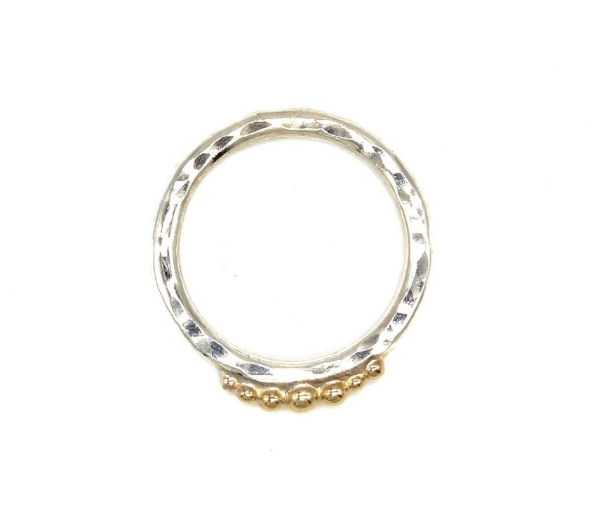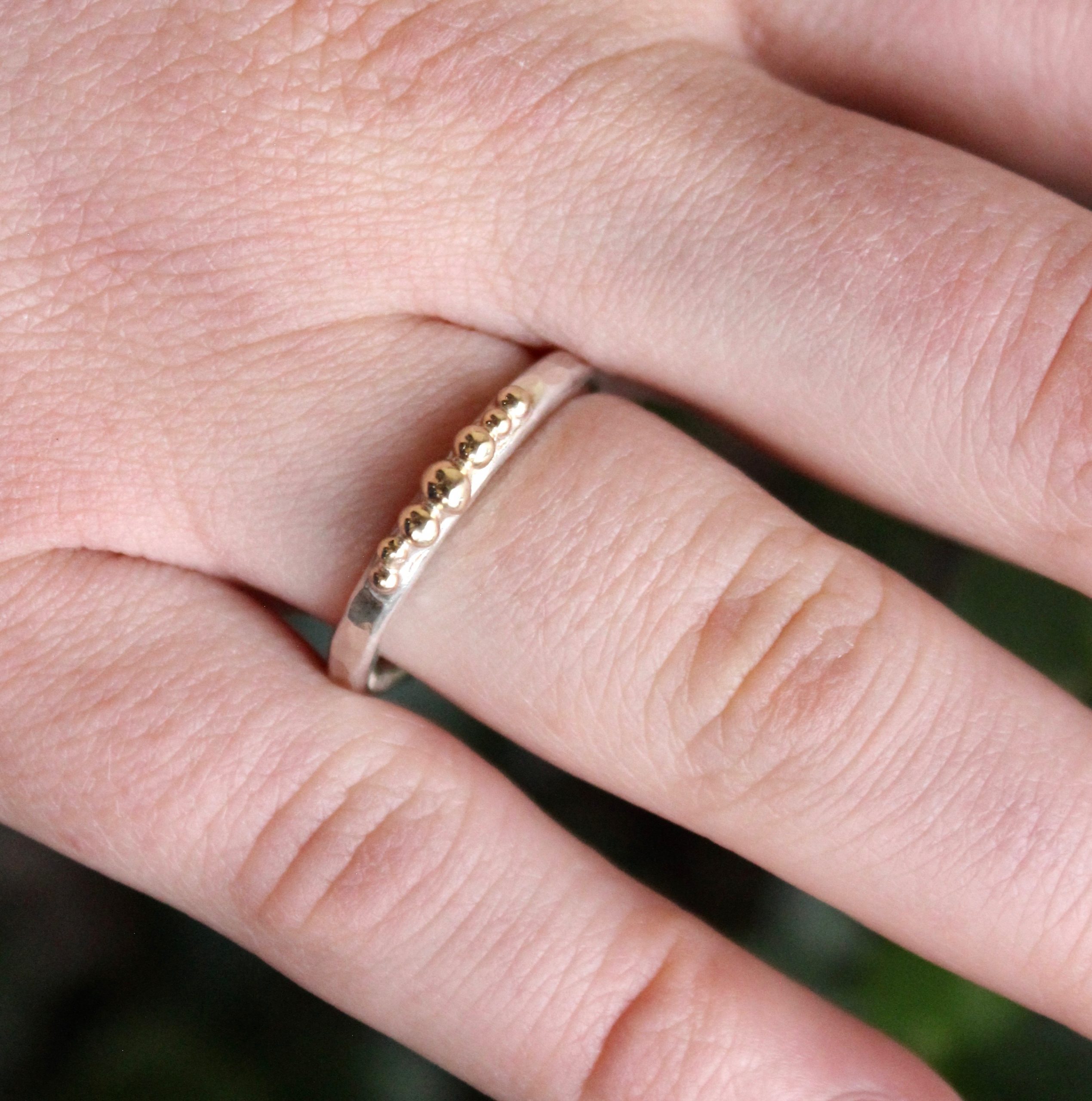 Handmade sterling silver ring with a hammered textured finish and seven 9ct gold delicate dot details across the band.