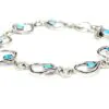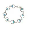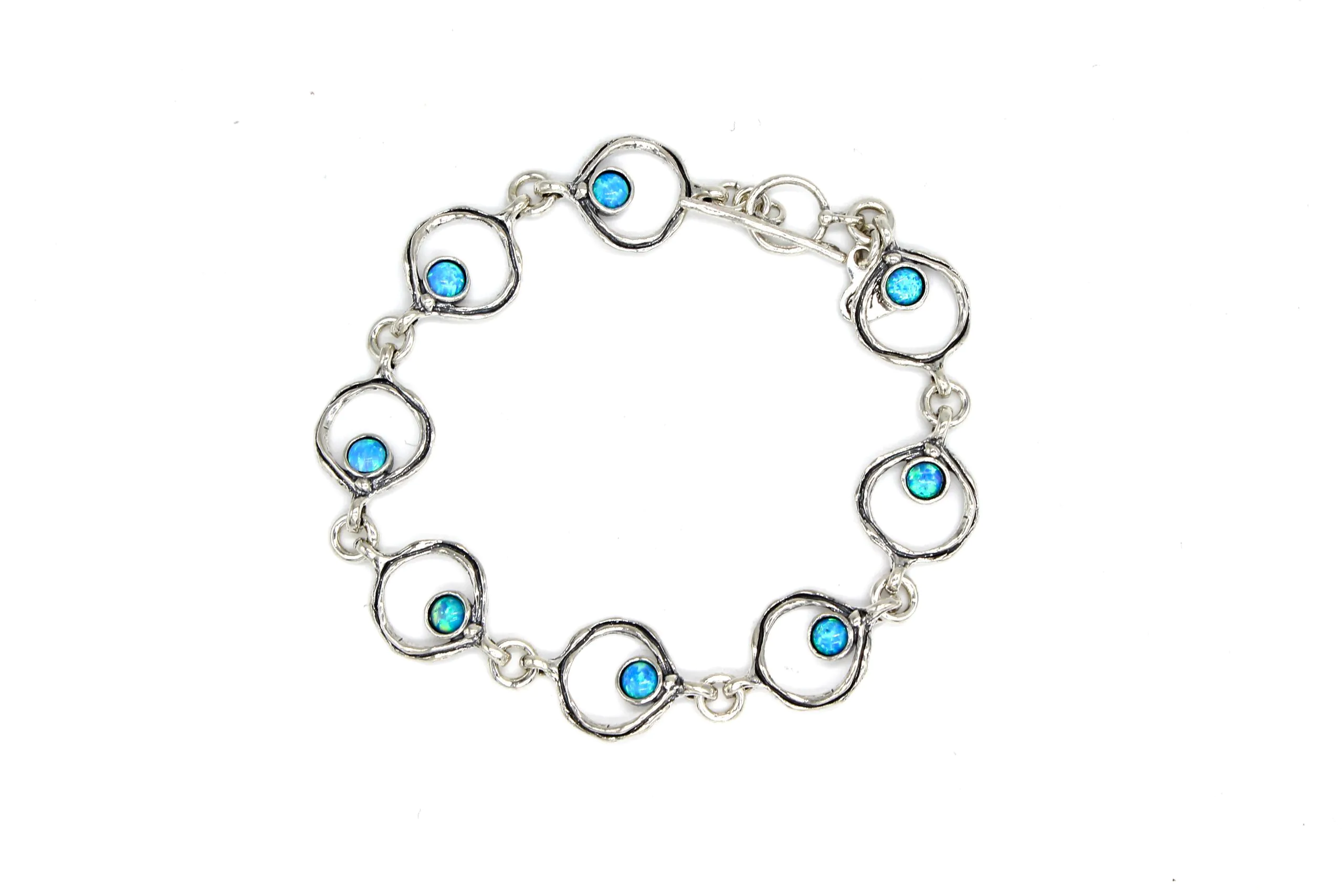 This stunning handmade piece features opalite stones in an oxidised sterling silver setting, to perfectly complement the iridescent blue-green glimmer of opalite, altogether mimicking the colours of an oasis. This bracelet features a T-Bar fastening.