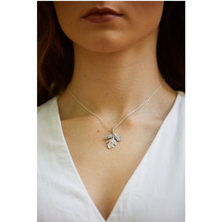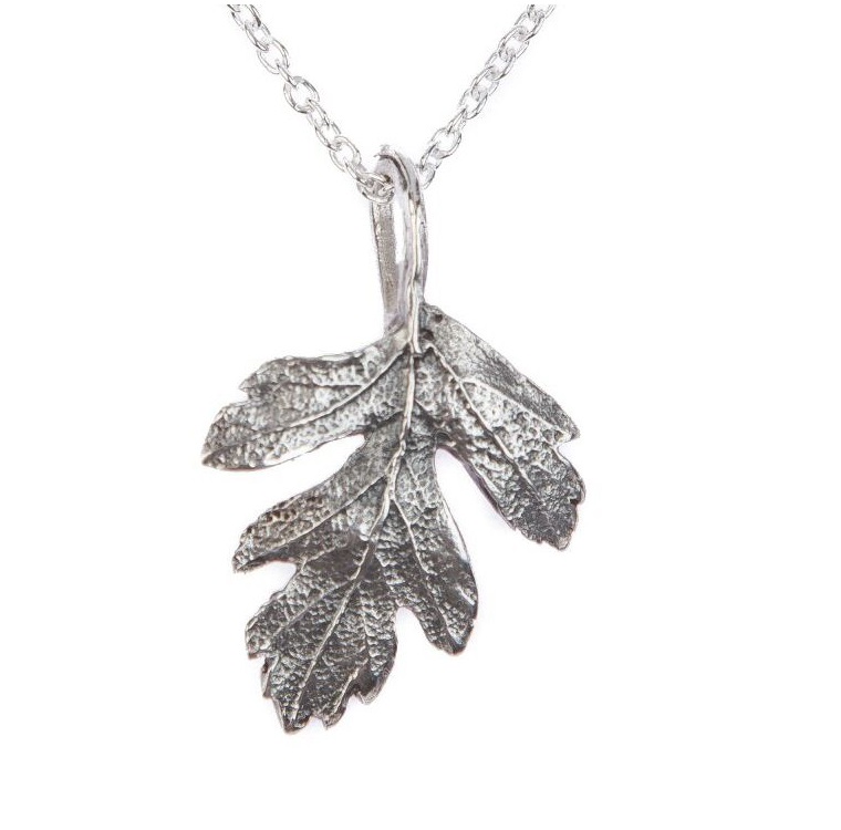 A stunning cast of a Hawthorn leaf in spectacular detail. The tactile leaf has fantastic texturing, which has been enhanced through mild oxidation and polishing of the silver to darken and accentuate all the tiny details of the leaf, making even the finest veins stand out. The leaf stem loops into a link, through which the chain passes.