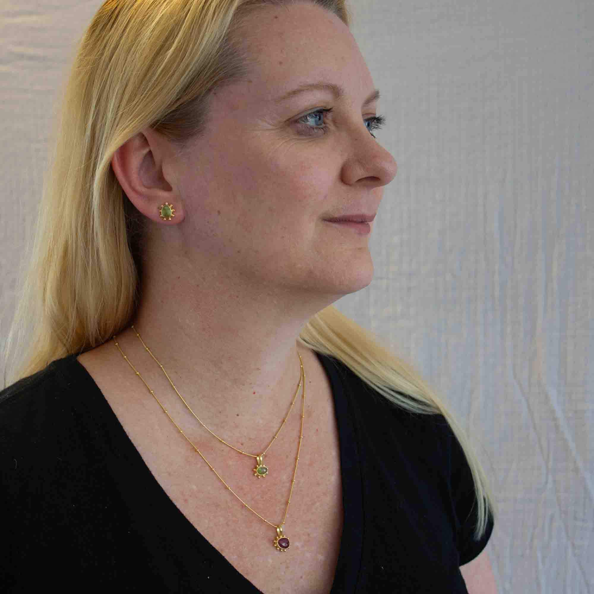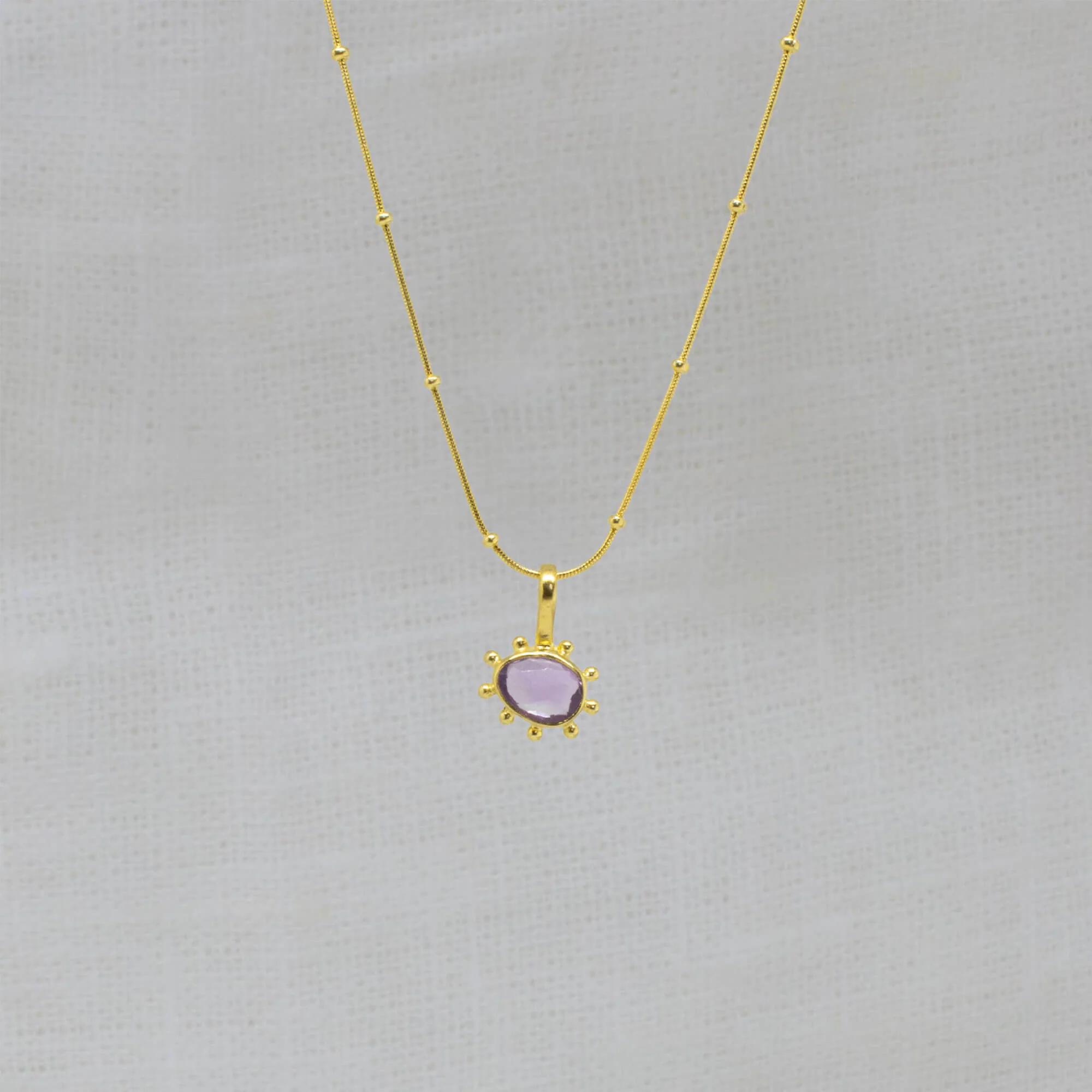 Our organic dot work pendant necklaces are embellished with natural, faceted semi-precious gemstones. Choose from Peridot, Amethyst, Citrine and Garnet, set in an 18k gold vermeil setting. These irregular, free size gemstones are all individual, making each piece unique.