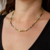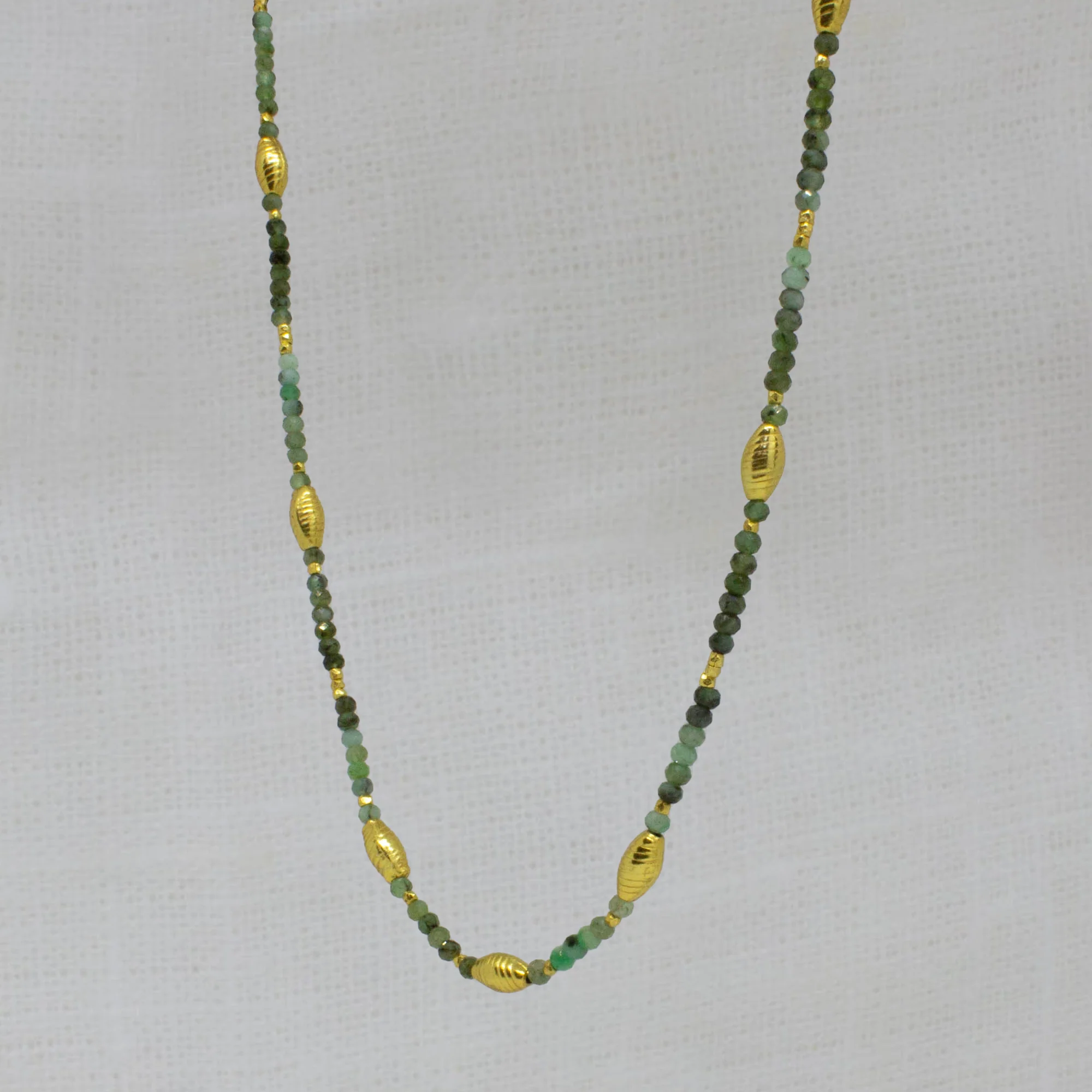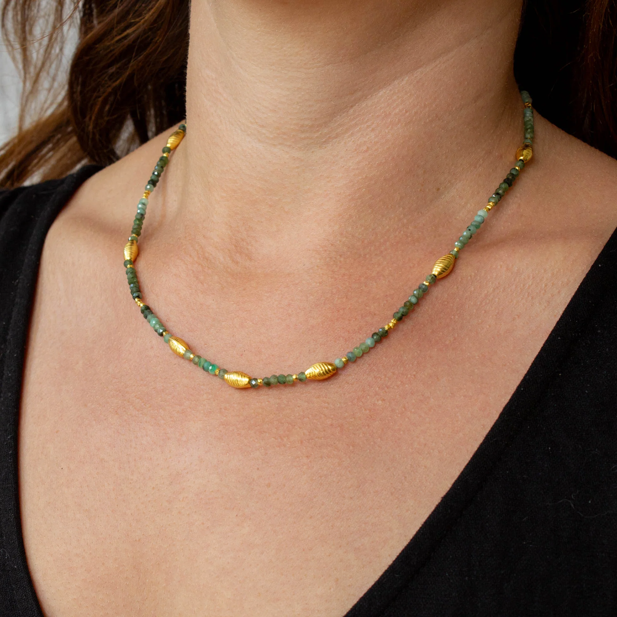 Our beautiful Koa beaded necklace in Emerald. Each of the natural gemstones feature stunning natural colour gradation and the gemstones are interspersed with handcrafted 18k gold plated silver textured beads.  These subtle and elegant gemstone necklaces are easy to dress up or down.