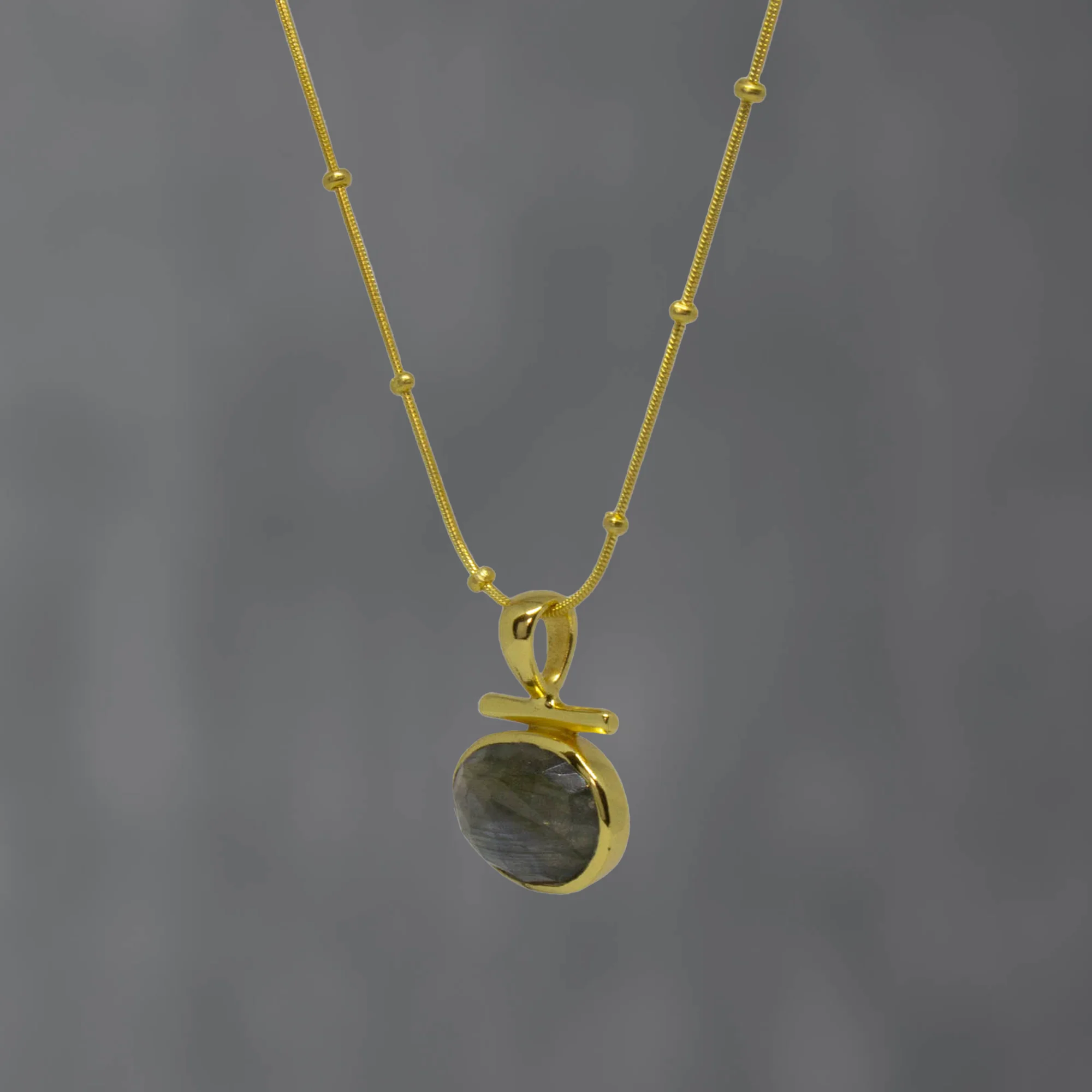Desinged by Annie in her London Studio, This minimal labradorite bar necklace is handmade in sterling silver with 18k gold plating. A simple gemstone pendant with a contemporary twist, complete with a studded adjustable snake chain.