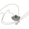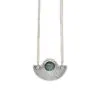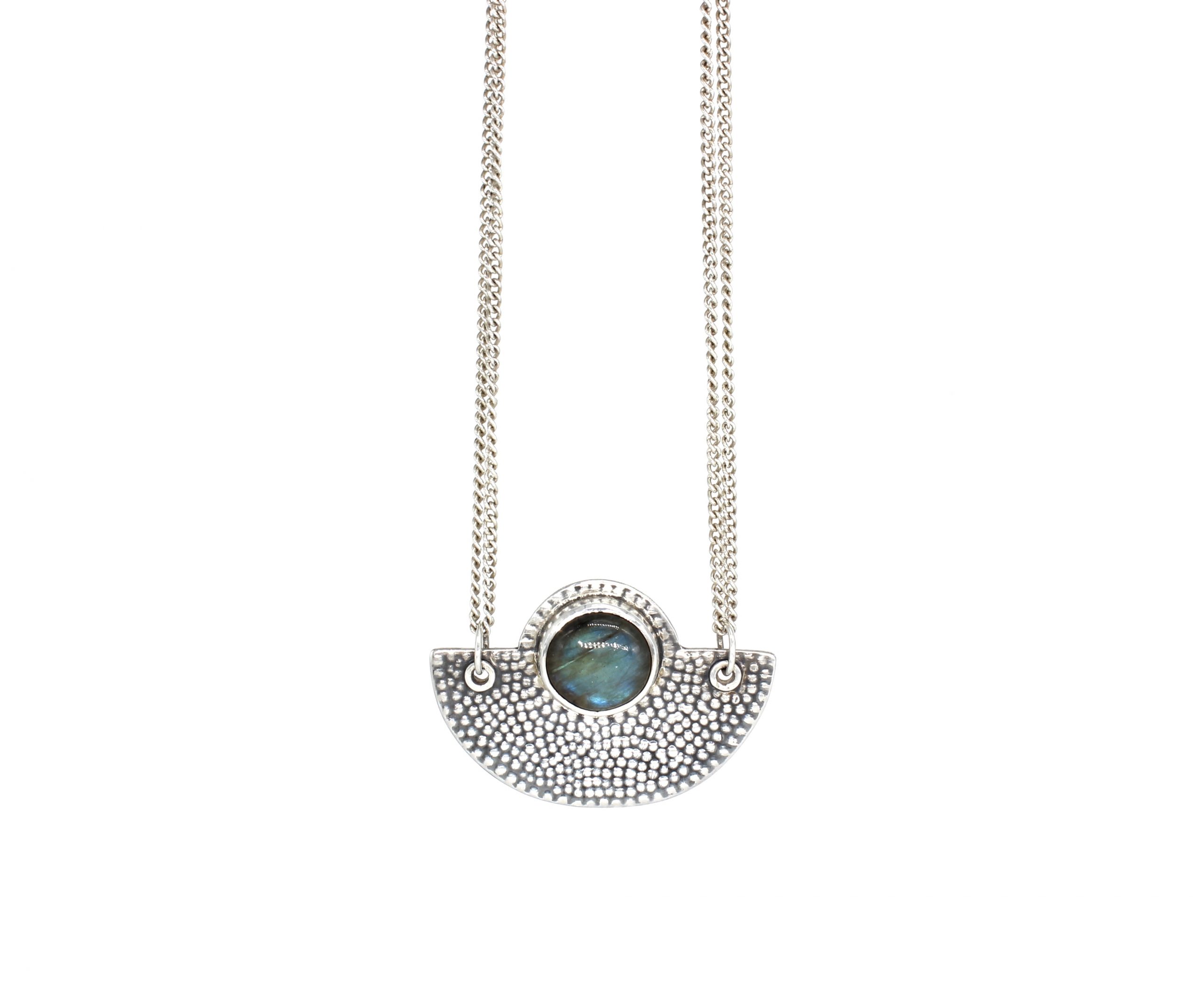 A textured and oxidised semicircular silver sterling pendant featuring a large embedded labradorite gemstone. This unusual piece comes on a silver curb chain that can be worn either as a short 16.5″ or a long 32″ necklace.
