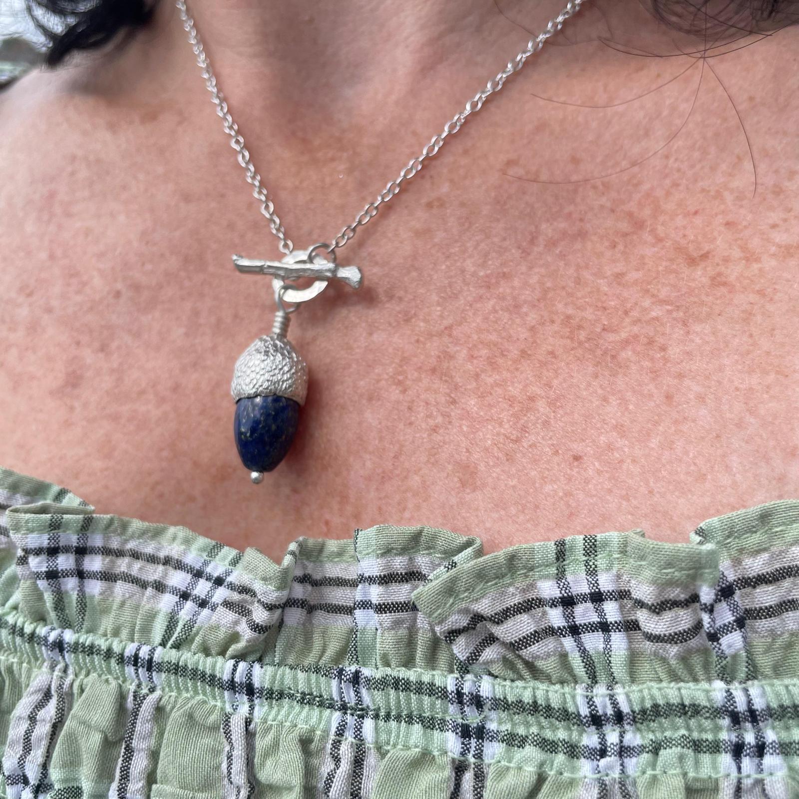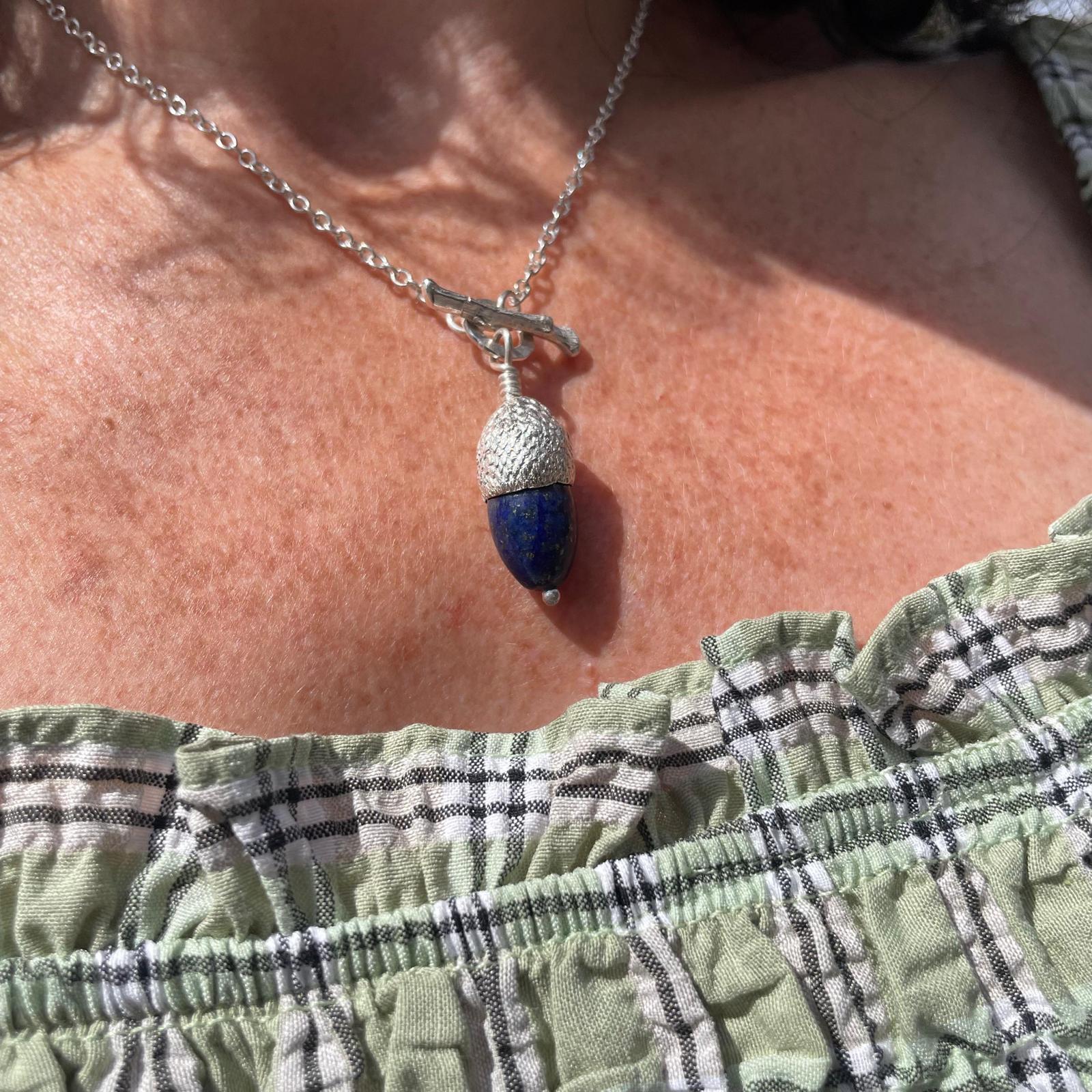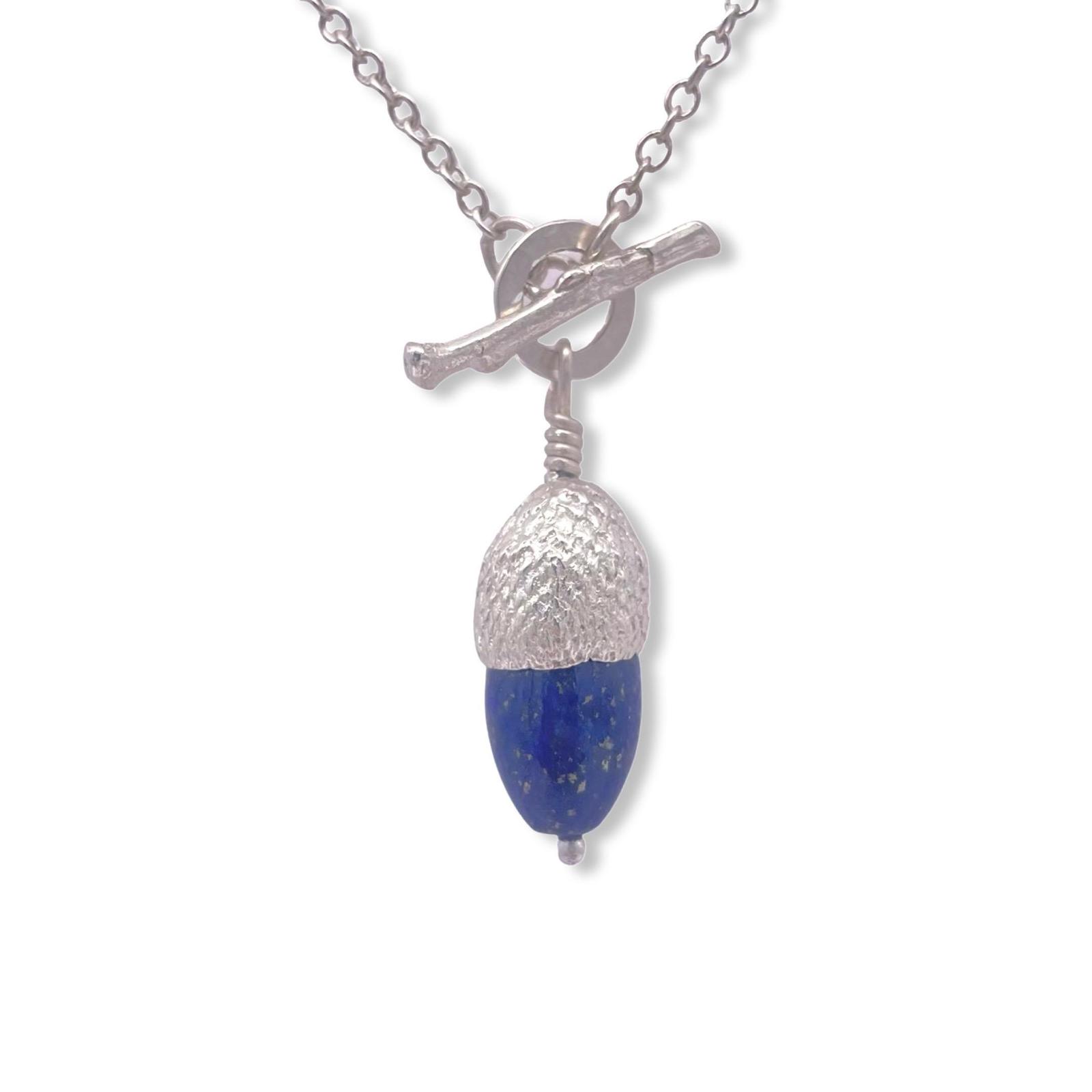 Stunning Blue Lapis, a unique stunning natural stone that is so beautiful, it is set in an acorn cup with twig detail clasp. this is nature at its finest, a cup picked up on a country walk, then cast by this British Designer, showing all its imperfections. Set with this beautiful unique Blue Lapis Stone representing where the nut once was. All dangling from a silver chain, if you love nature and walking this is the perfect gift for you.