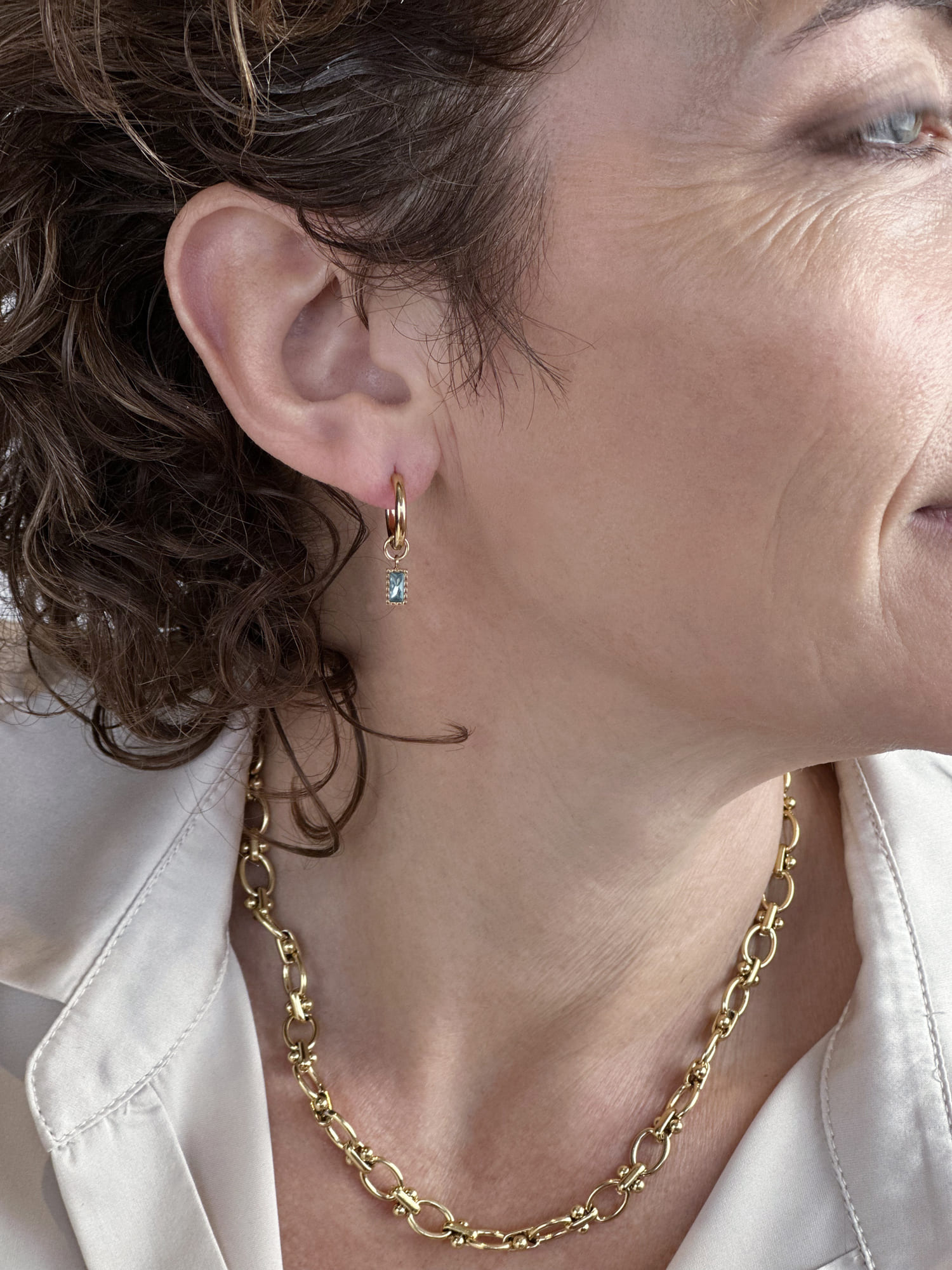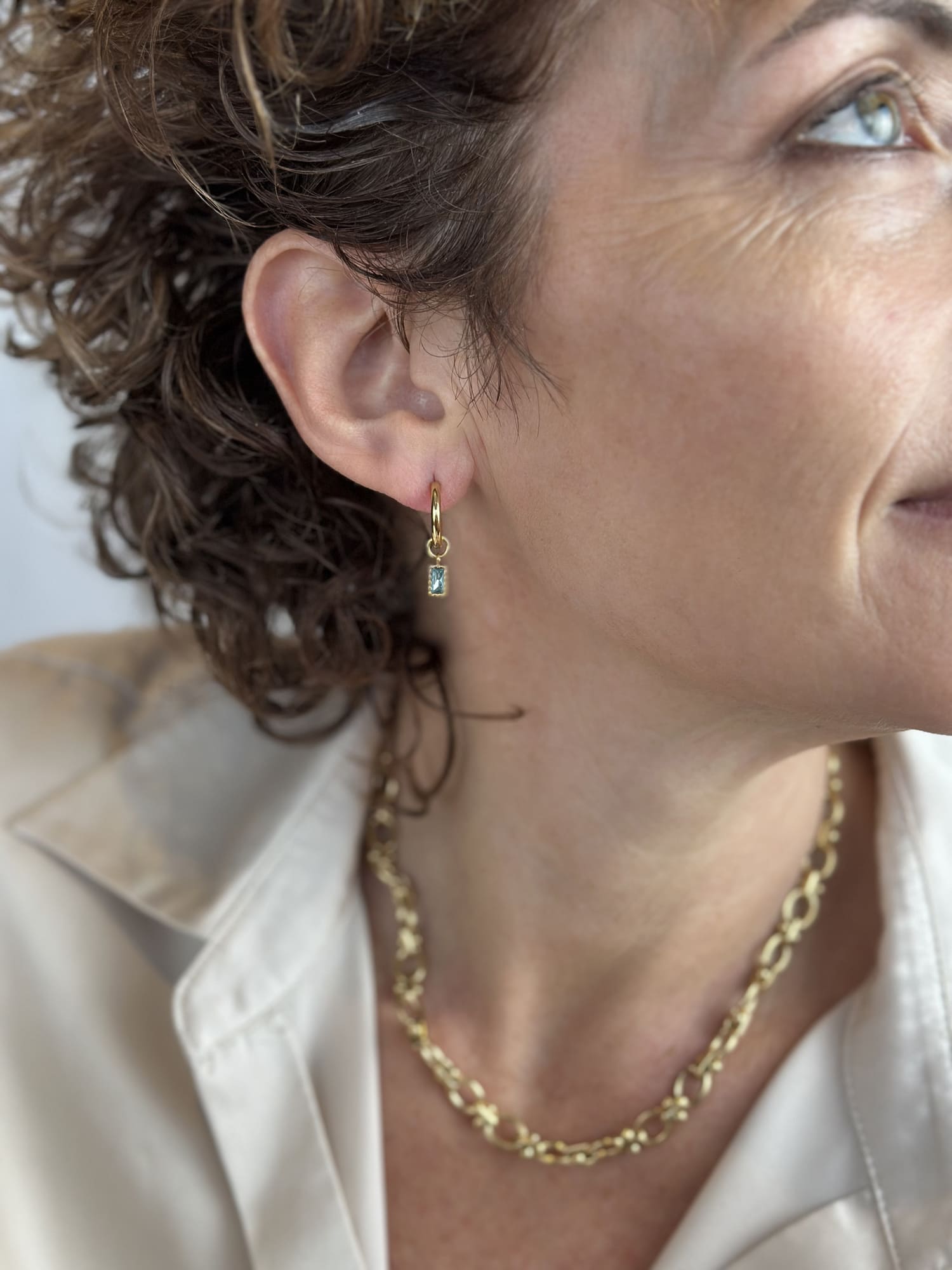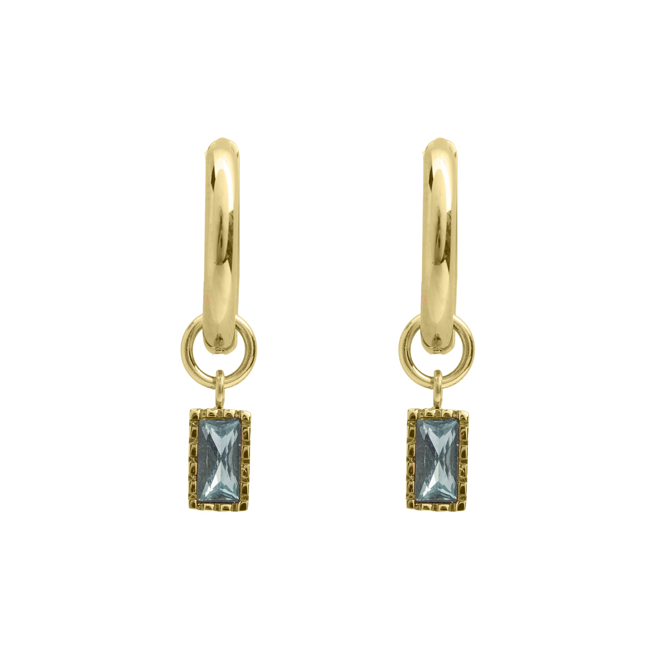 A refined pop of colour for everyday wear. These gold huggies feature a rectangular London blue-toned baguette CZ stone, framed in a textured bezel for added depth and detail. Sleek yet eye-catching, they’re perfect for elevating your stack with a subtle hint of glow.