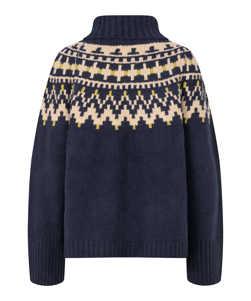 This knit will quickly become a wardrobe favourite. It is chunky, warm, and inspired by traditional Icelandic patterns – perfect for the season’s chilly days. The rib knit roll collar is delightful to snuggle into, while the A-shape cut adds a feminine touch. Style the knit with soft jeans or relaxed jersey trousers for a comfortable and stylish look with plenty of personality.