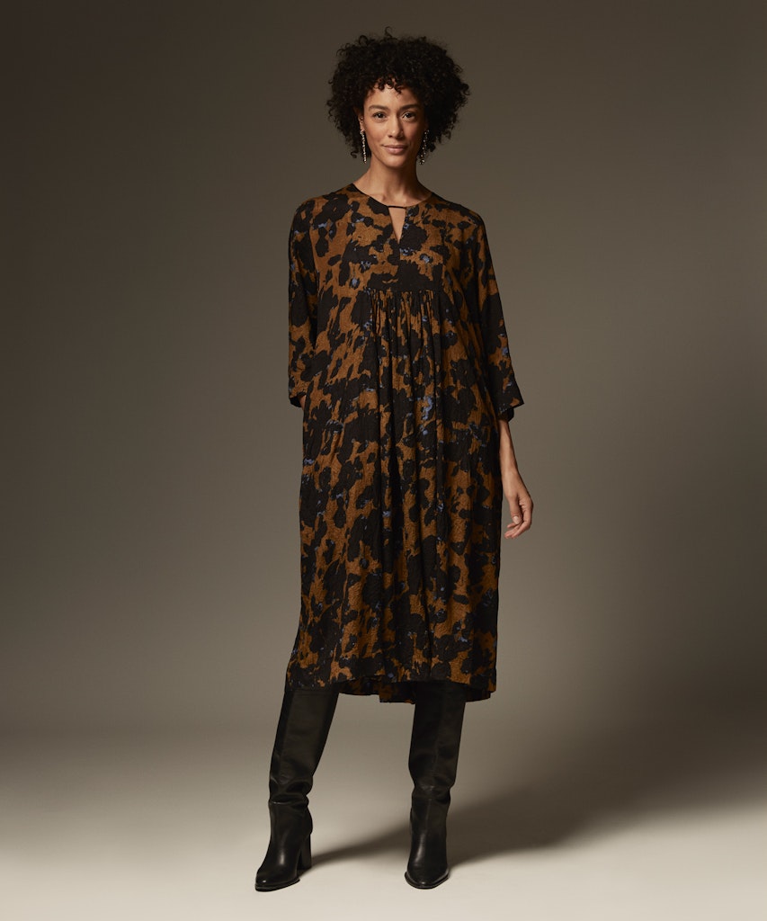Elegant and easy – this dress is a sure favourite for any occasion. It’s made from soft viscose with an artistic print and has delicate slit details in both the front and back that add a feminine touch. Small pleats at the front highlight the beautiful A-shape and give the dress a light and lively drape. The discreet slit pockets make it both practical and relaxed. Wear it with a short jacket – or let it speak for itself.