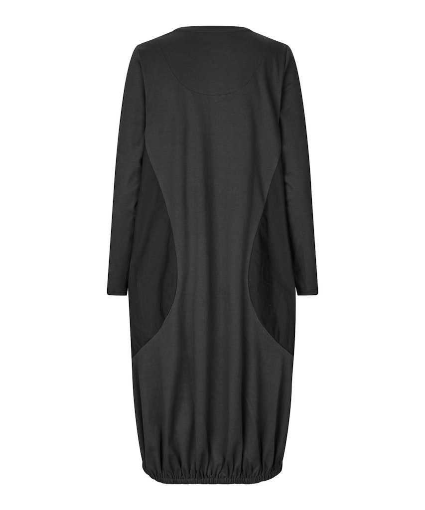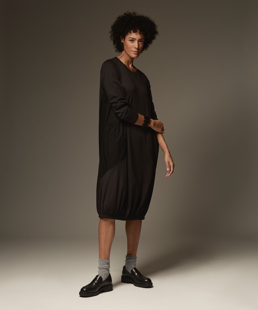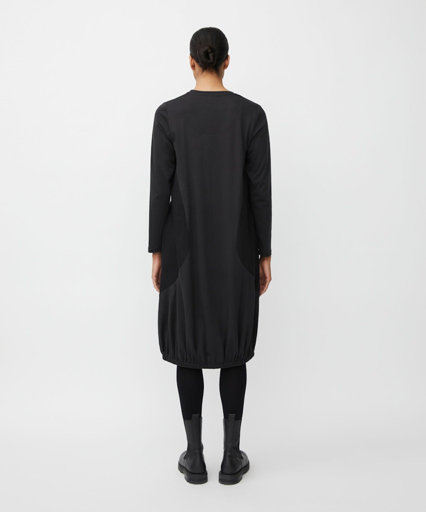 Create a personal and modern look with this dress crafted from contrasting materials. It combines soft jersey with crinkled cotton, providing both comfort and style. The simple design with a round neckline and narrow sleeves is elegantly offset by graphic side panels. The narrow elasticated edge at the hem creates a flattering balloon shape, giving the dress its distinctive look. Add a long necklace or a colourful scarf to personalise the style.