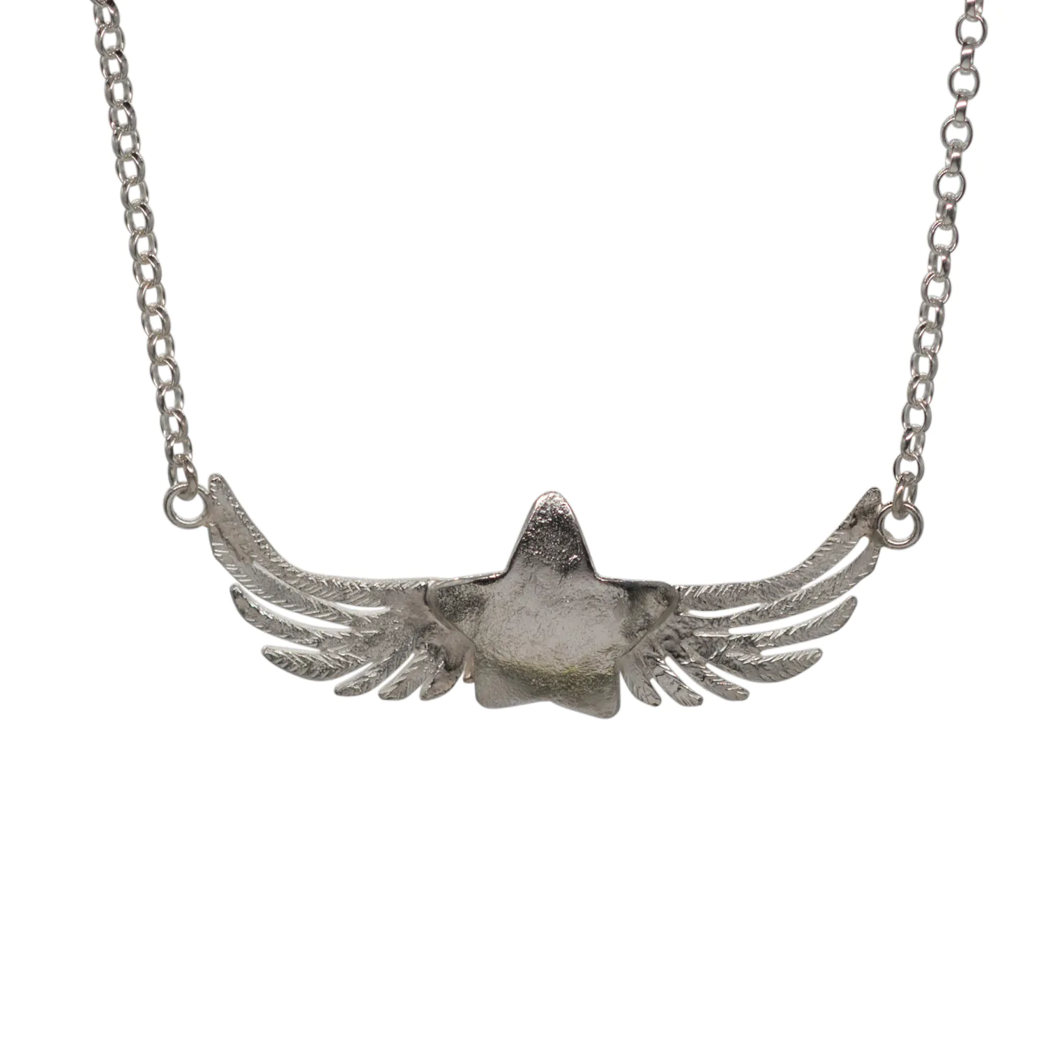 Handmade organic form rounded end star and wing pendant made from solid sterling silver.