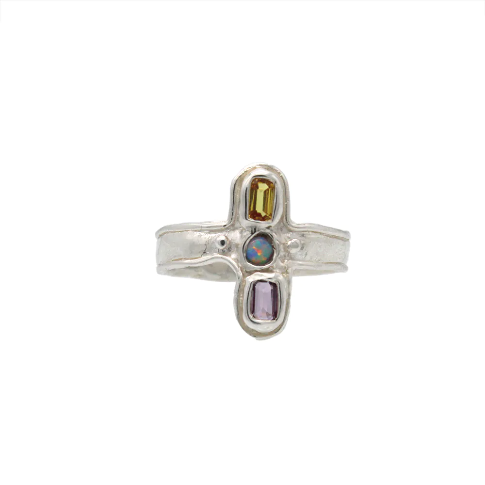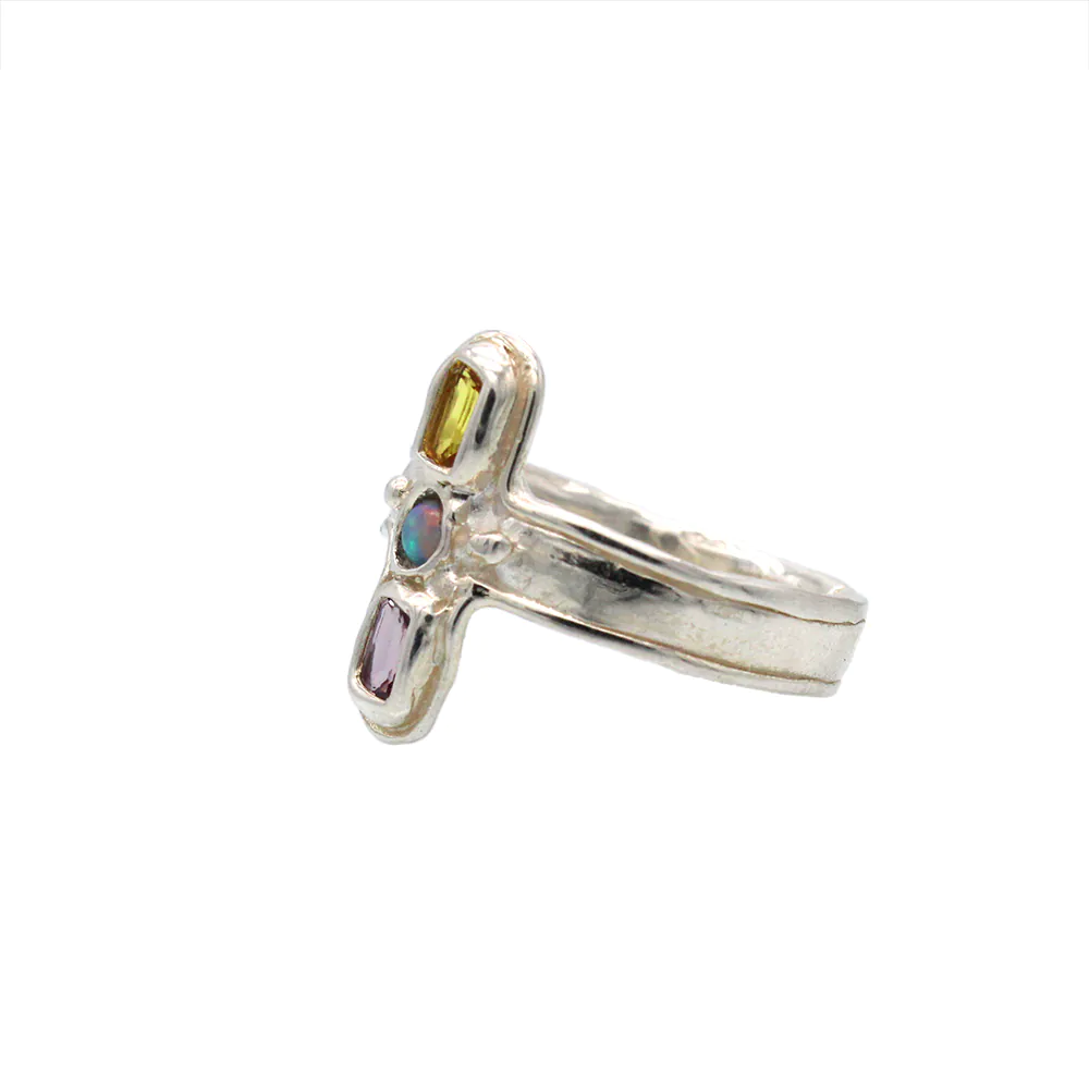 Pretty pastel Millie Savage Ring handmade from sterling silver. Features a dainty opal flanked by 2 natural-coloured sapphires.