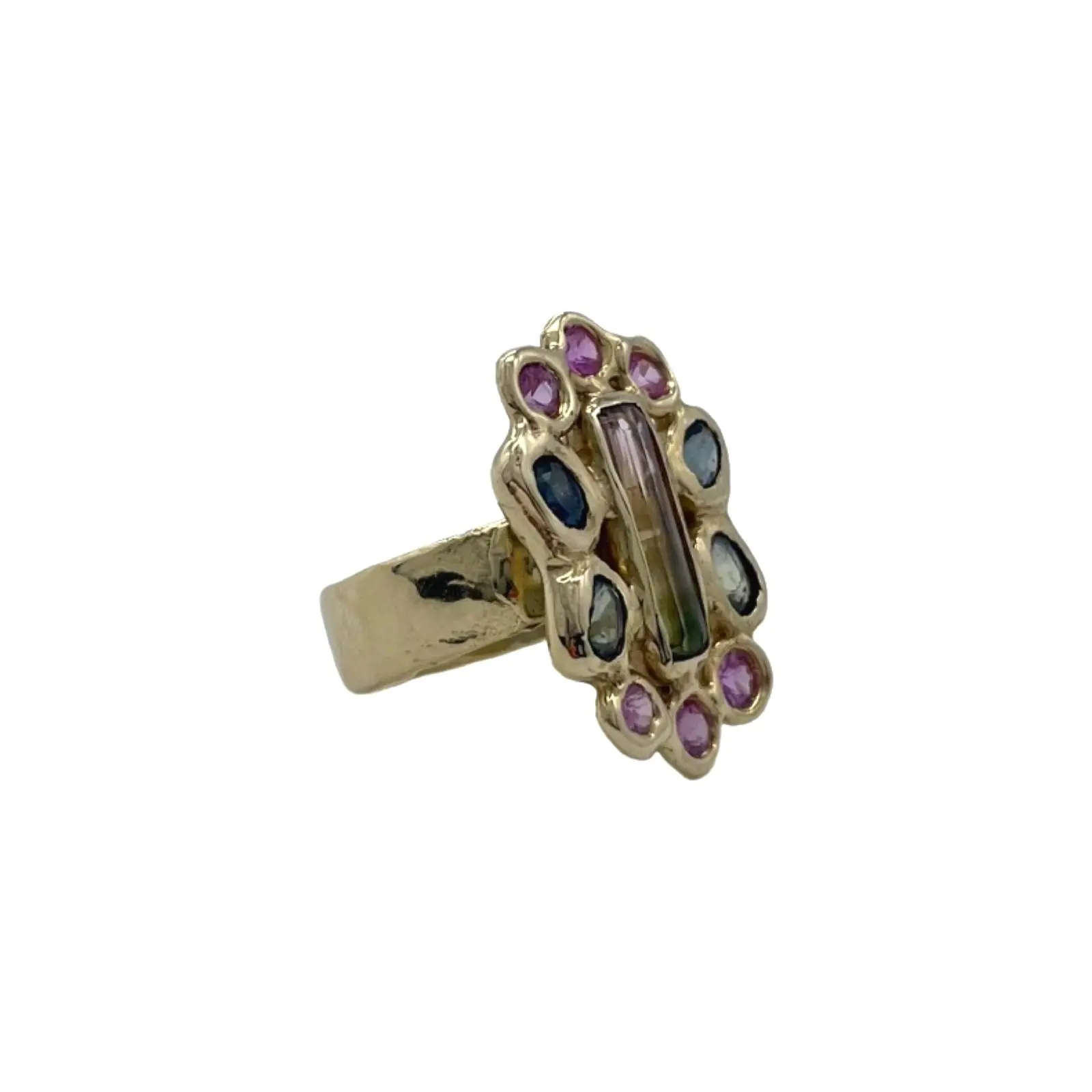 Go Figure One Off Beauty Ring, yes there is only one of these and we have it, Millie’s one off designs are really sort after and when we saw this on we had to have it to offer to our amazing A7G customers, who love the different and unique. The central tourmaline is stunning shining shades from pink through yellow to greens & teal, it is looked up to by beautiful natural sapphires in Pink, Blue, Lavender & Green. This is statement ring but one that would look great on a casual day with your jeans and trainers but when you take it on a night out it will radiate different colours every time it is moved. Can you imagine it on the dance floor, or underneath the natural sunshine on a Summers Day, but equally in the Winter pop it on and you will be filled with joy.
