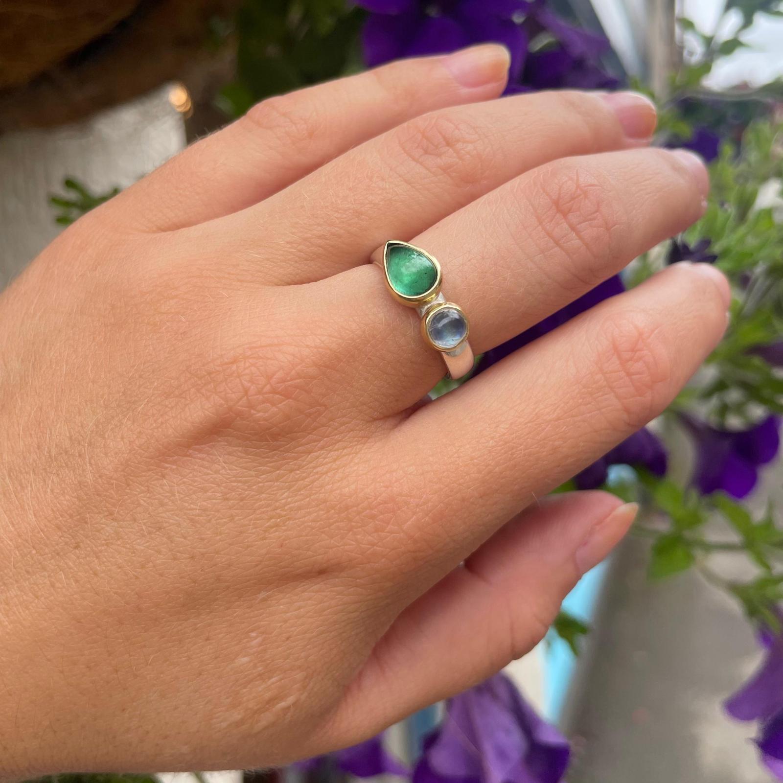 A lovely ring that combines an emerald green tourmaline set alongside a beautiful pale blue moonstone, both are set in 18ct gold and held on a silver band. Handmade in the UK by a lovely British Designer in her home workshop. This ring can be worn on its own or you could if you want to create your very own stack, contact us for help with this if required. The perfect ring for everyday and an evening out. Treat yourself or why not purchase for a loved one. (Just a little note if you are interested in the powers of stones tourmaline is known for its eccentric healing powers.)