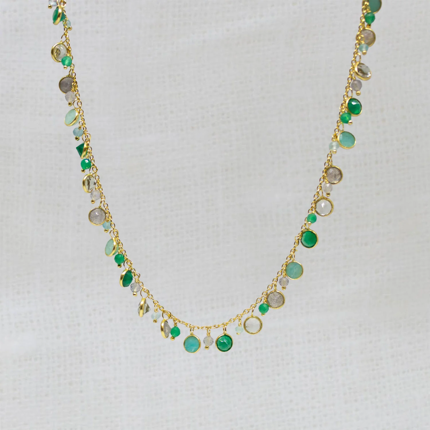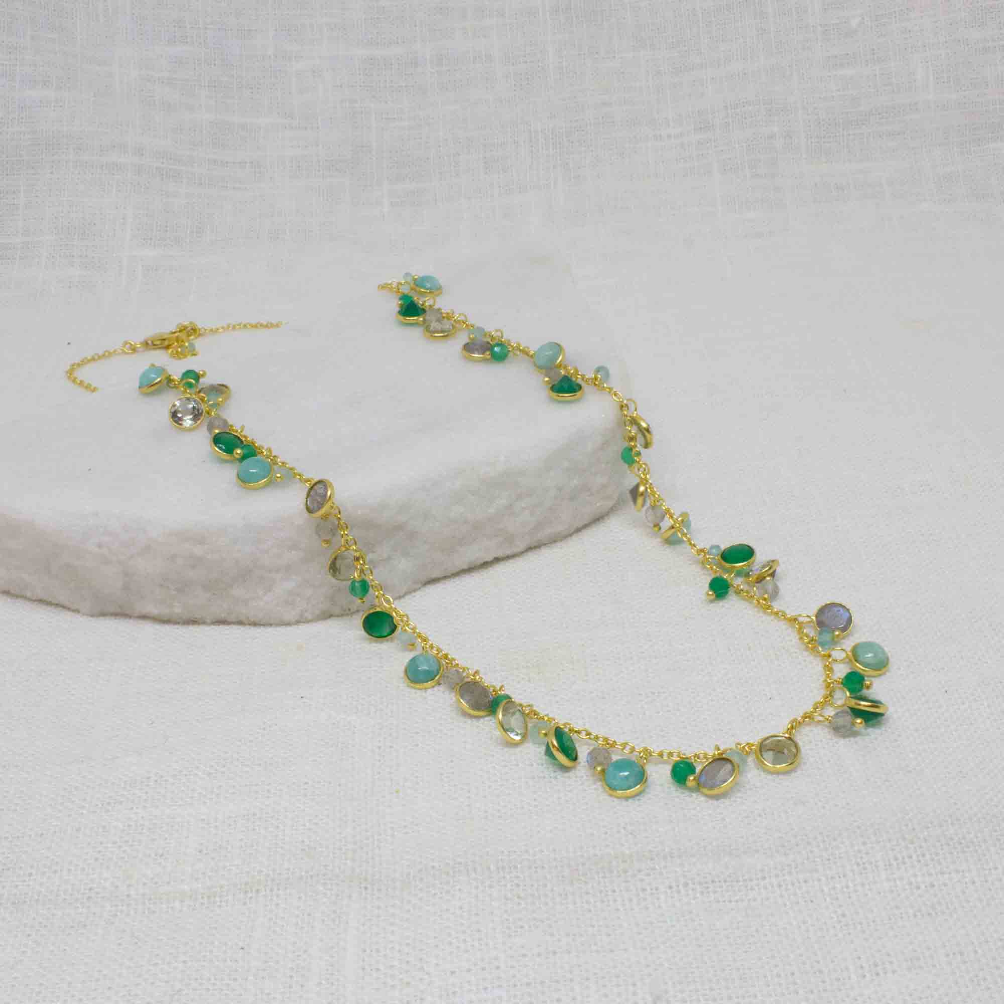 Multi Gold Plated Necklace With Green Onxy, Labradorite, Green Amethyst, Amazonite Gemstones