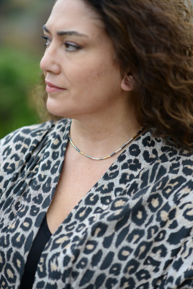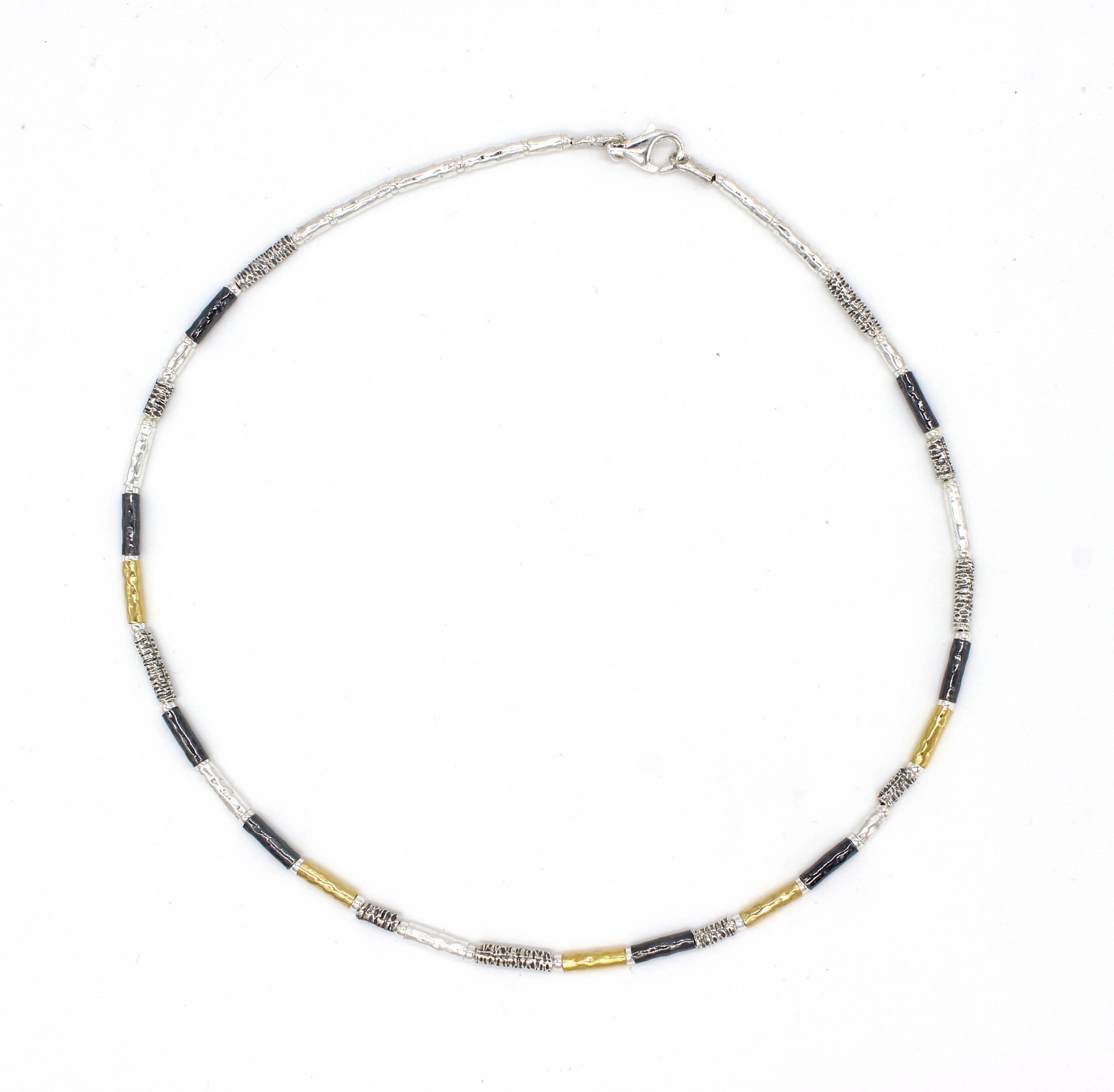 A multi-tone necklace with textured tube beads in oxidised silver, silver and rolled gold. Matching bracelet available here.