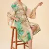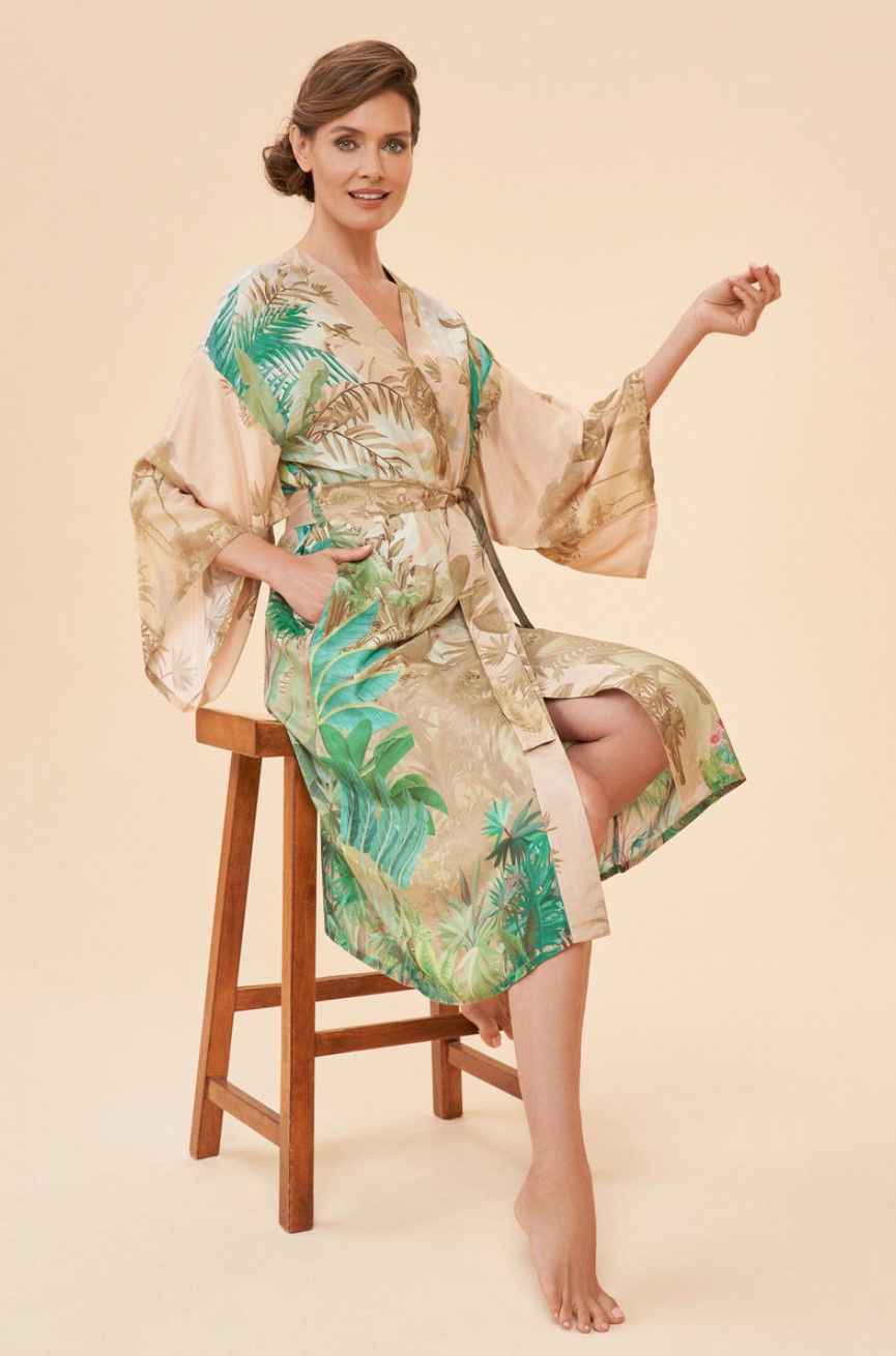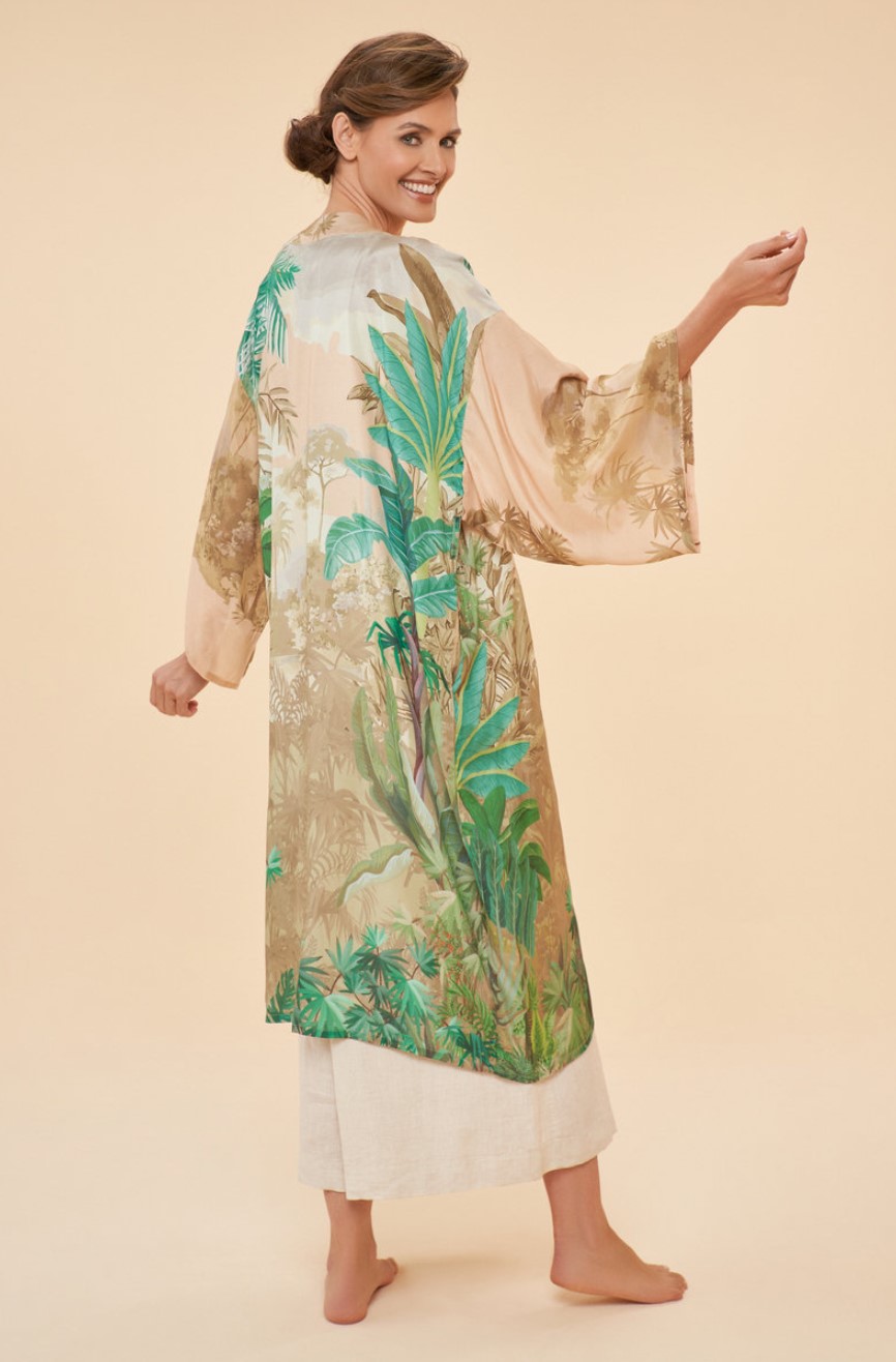 Our Oasis design in coconut is directly inspired by travels into the Borneo jungle. Featuring jungle vines and ancient trees this kimono gown is completely beautiful. This gown is sure to have travel and fashion lovers swooning. Equally suited to wrap around your sleepwear or to elevate your dinner party look, you will never want to take it off.