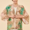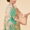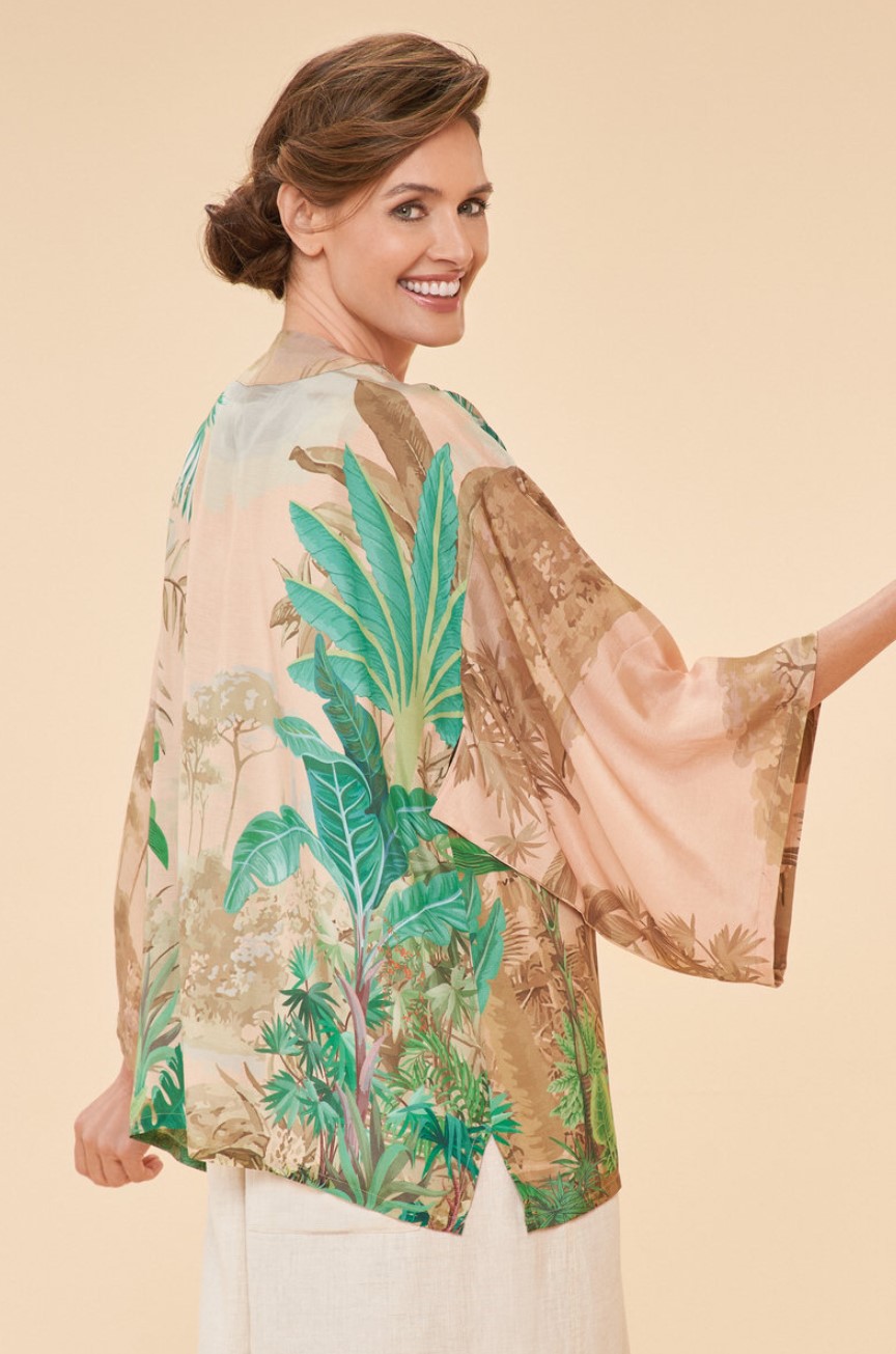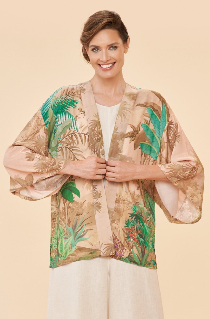 Our Oasis design in coconut is directly inspired by travels into the Borneo jungle. Featuring jungle vines and ancient trees this kimono jacket is both elegant and striking. This jacket is sure to have travel and fashion lovers swooning. Sure to elevate your dinner party look, you will never want to take it off.
