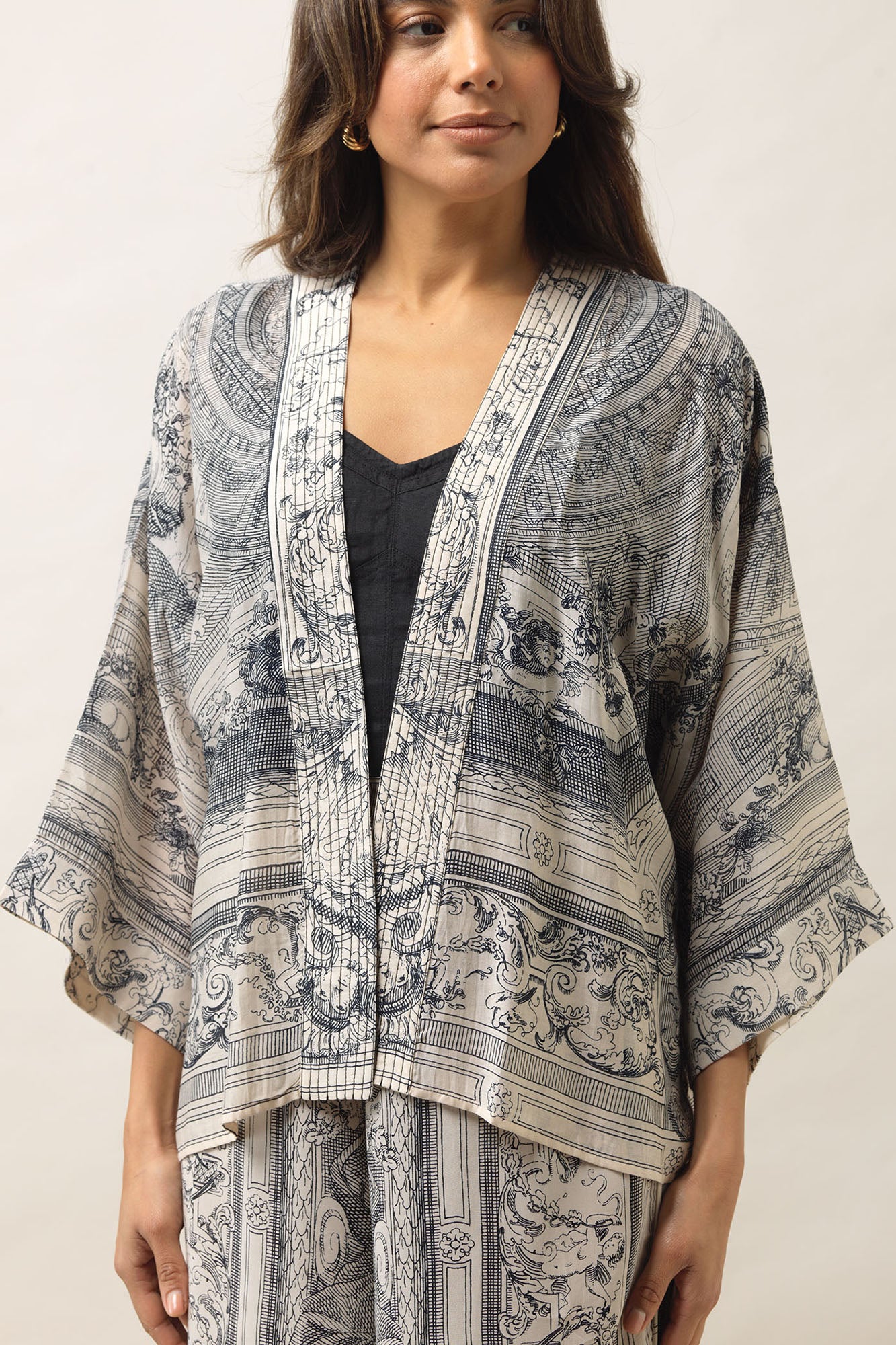 This beautiful hand-drawn black print features scenes reminiscent of the highly decorated ceilings in grand theatres. The monotone colourway focuses the eye on the intricate antique details while creating an imminently wearable and sophisticated print.