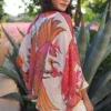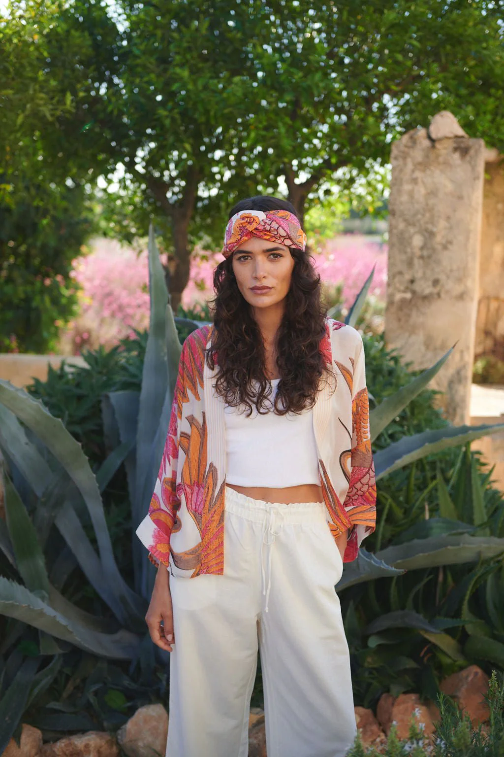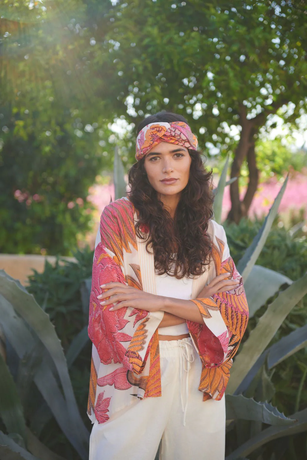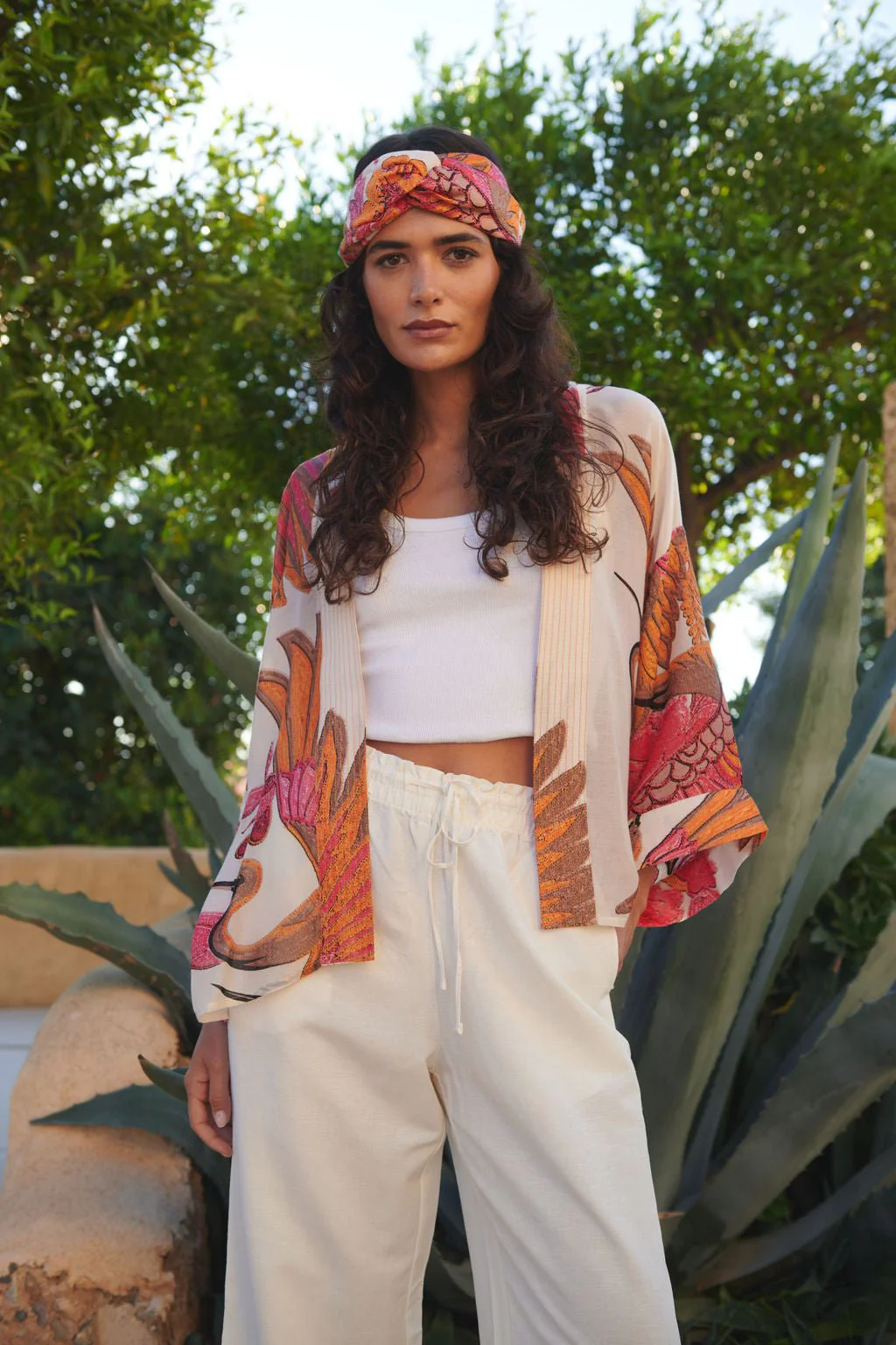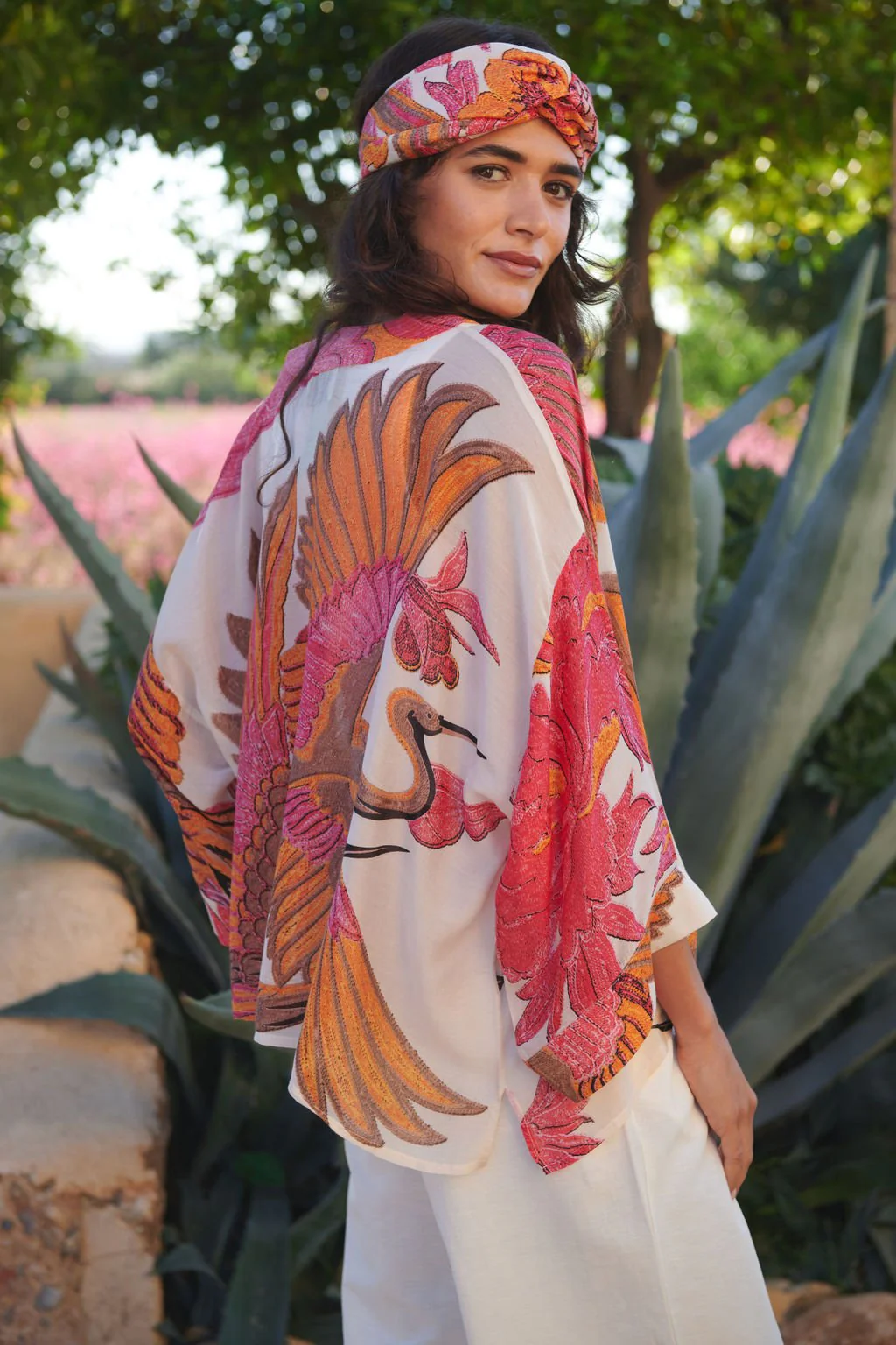 The crane, a symbol of happiness. This bold pattern with an exciting mix of colour is delightful. This clever colour palette of pinks and oranges on the crane set off against the ecru background will make the wearer smile!