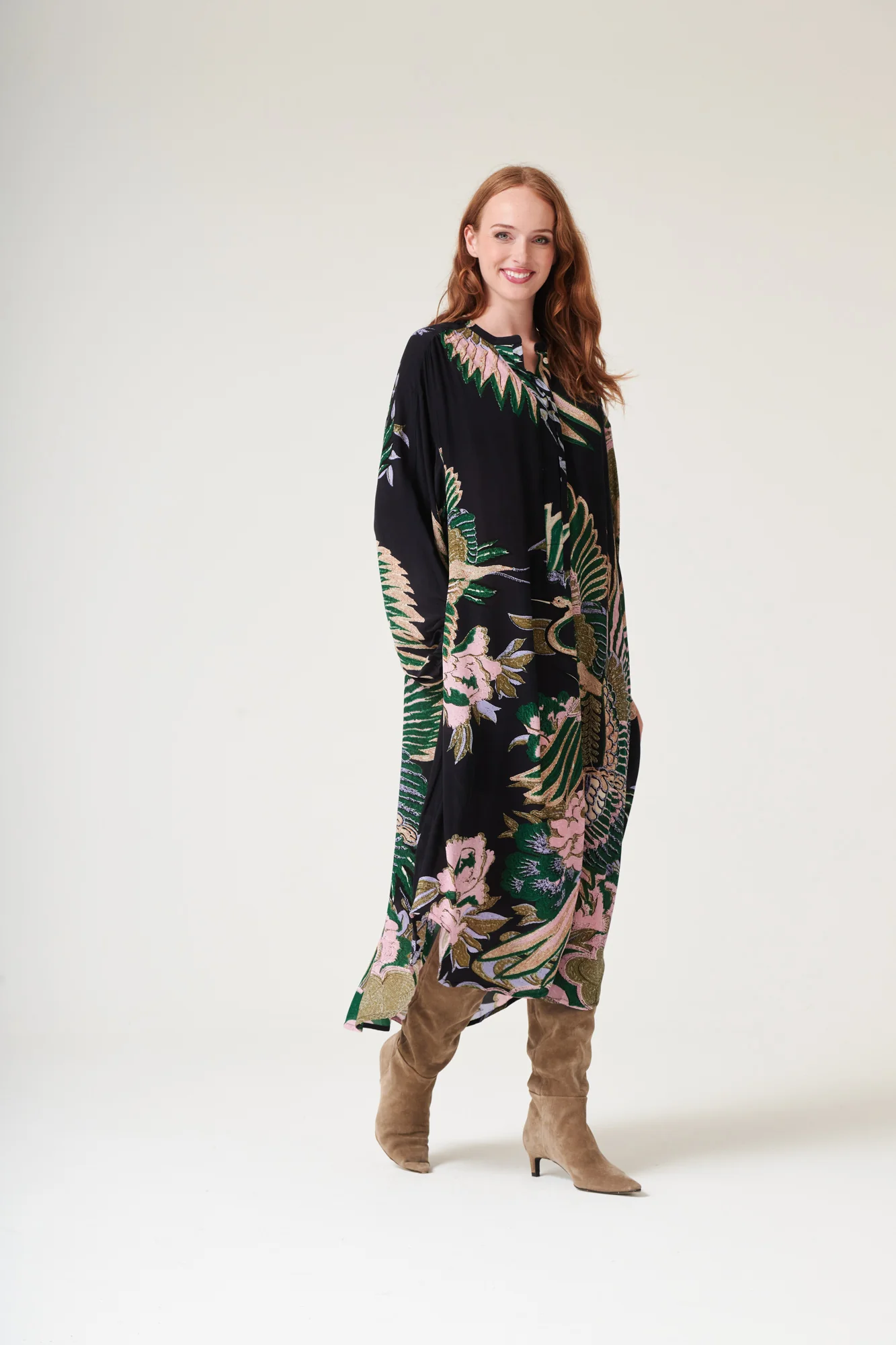 Our crepe Darcy dress features a flattering mandarin collar with a concealed placket front, pockets and loose-fitting balloon sleeves. Our mid-length dress is half lined in organic cotton for ultimate comfort.
