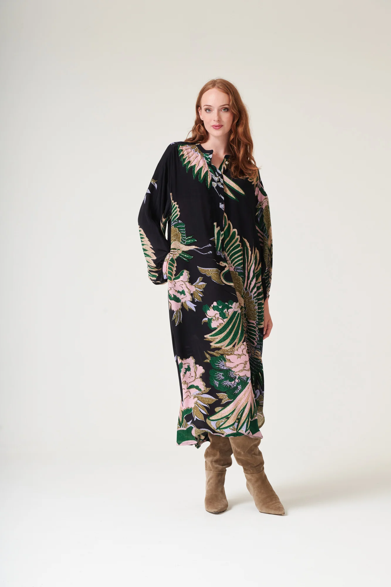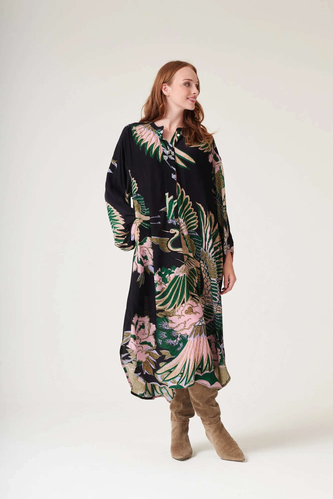 These large, graceful cranes in sand, pink and emerald, green fly across this ‘nearly black’ base.