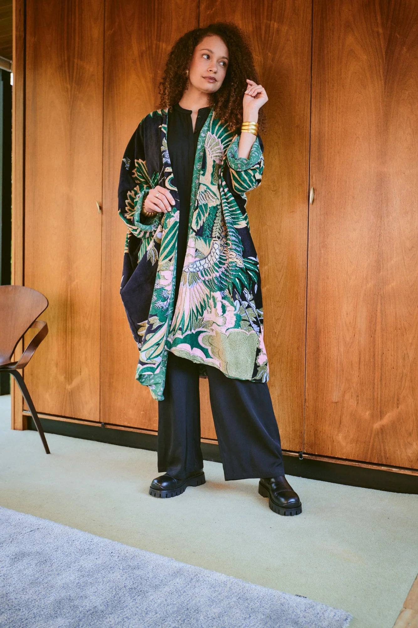 A luxury statement piece showing the full beauty of our bold signature designs. Made from soft cotton velvet with a complimentary printed lining, loose-fit sleeves, and hidden side pockets.