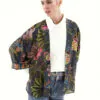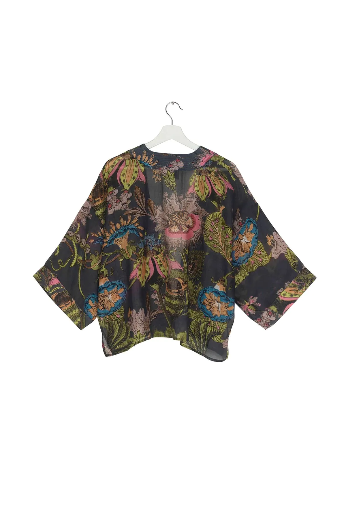 One Hundred Stars Eccentric Blooms Kimono in Charcoal features prominent psychedelic florals and oversized seedpods making delicate use of neon greens and fluoro pinks teamed with a rich Charcoal background.