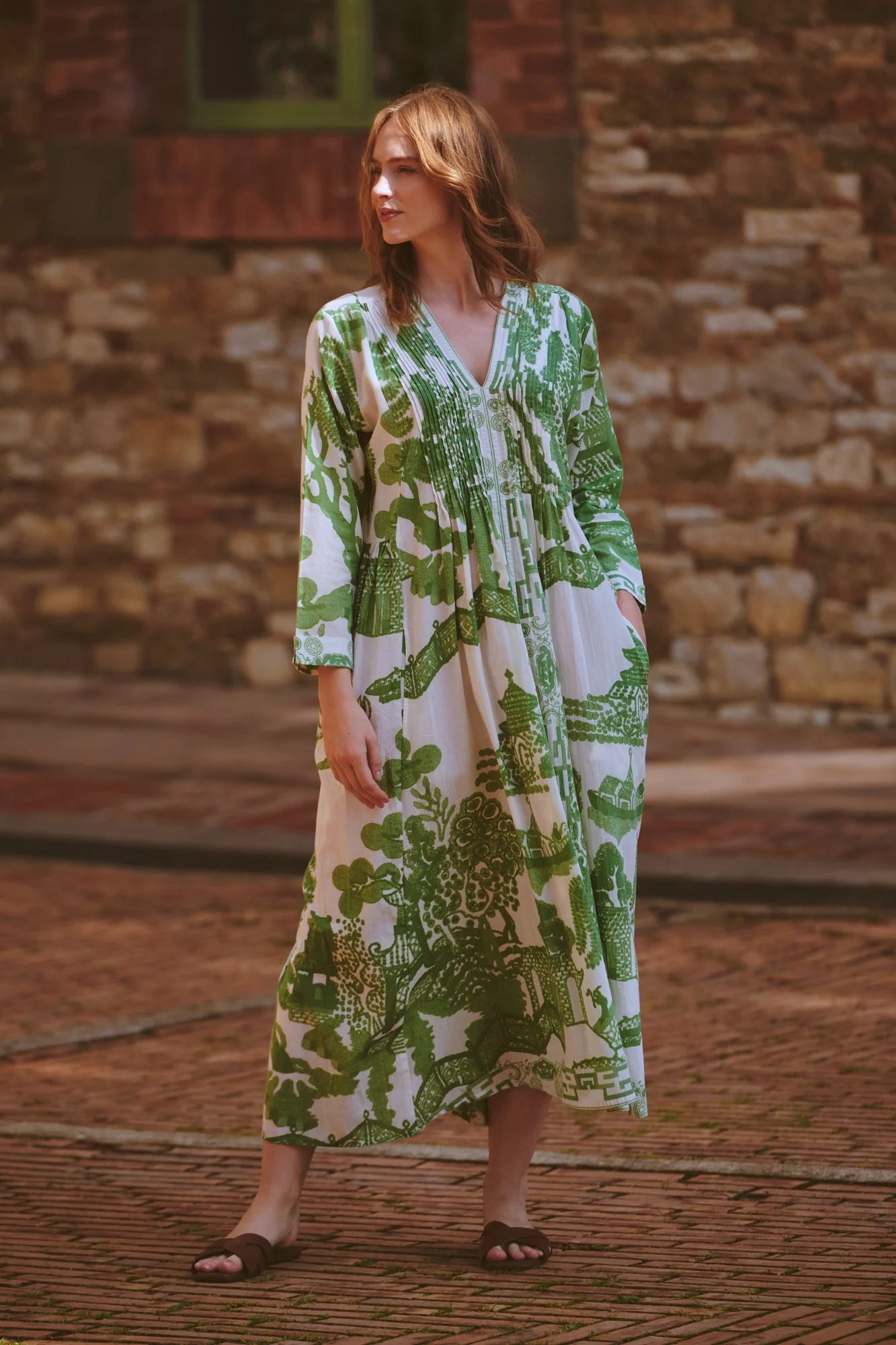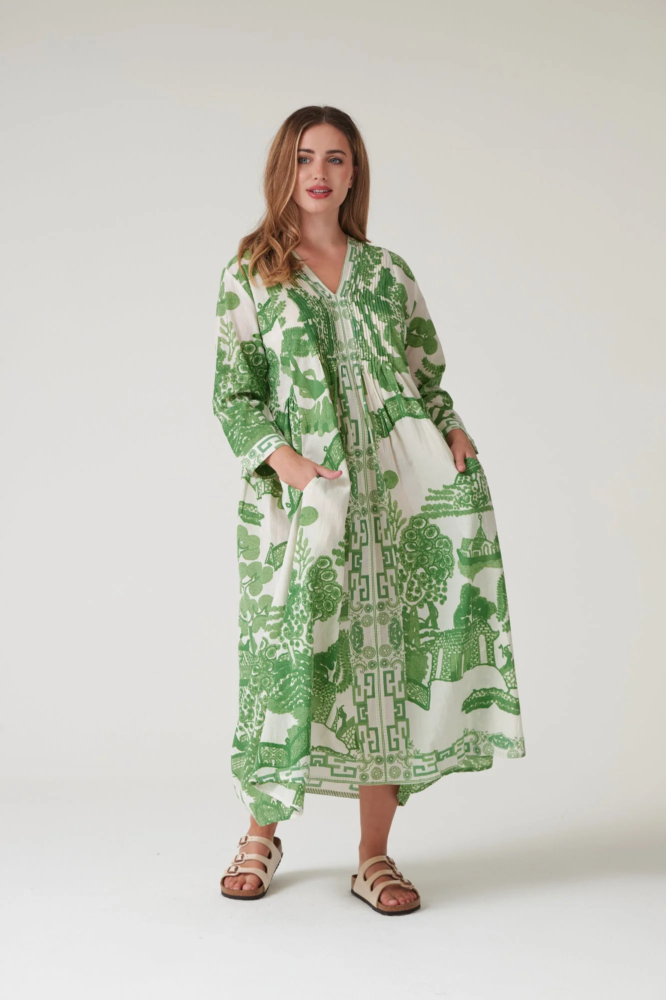 With its delicately pleated placket top leading down to a flowing maxi skirt, this dress showcases the entire One Hundred Stars signature print.