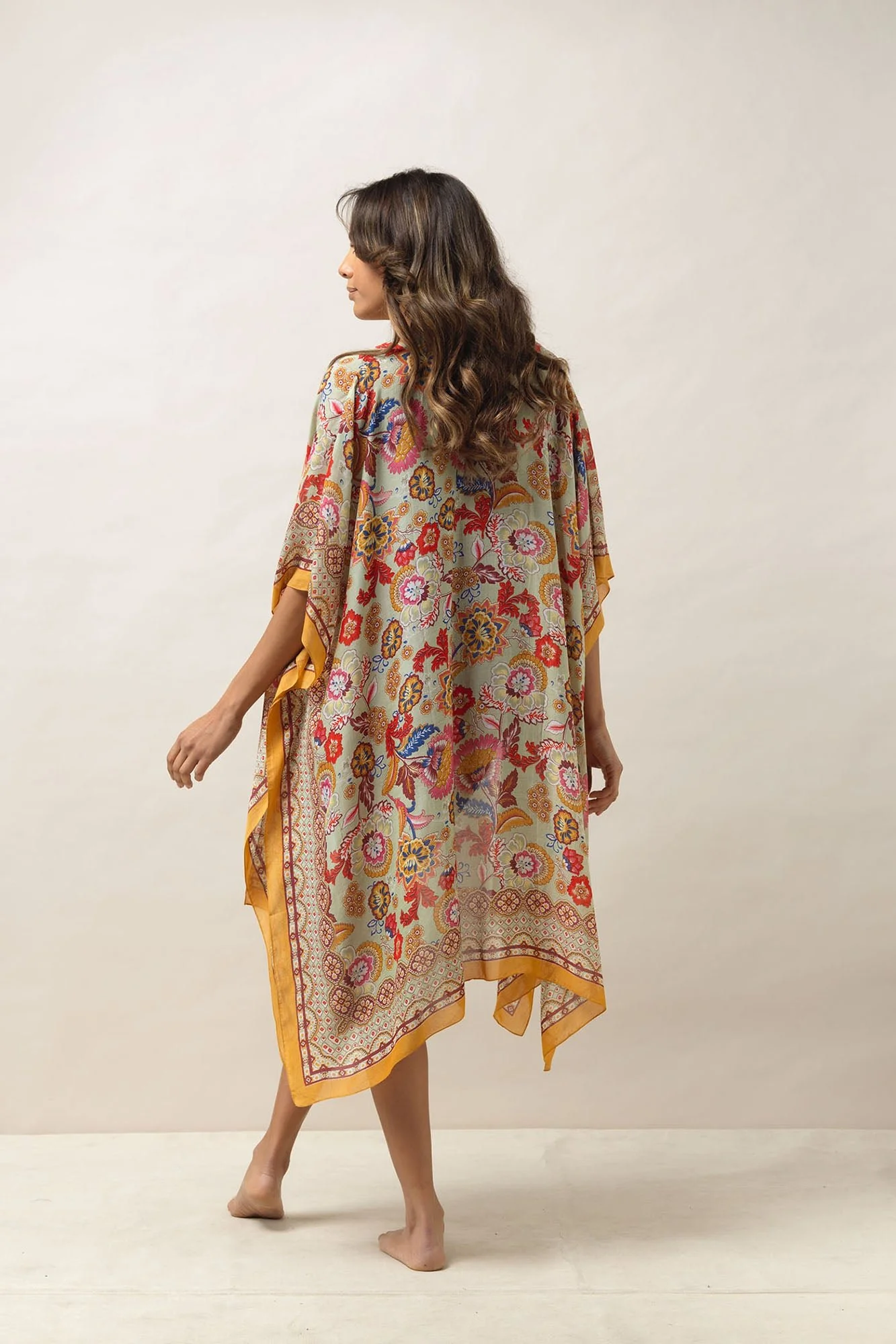 The Indian Flower print is rich with vibrant floral motifs and intricate traditional borders set against a sophisticated taupe background. The colour palette is chicly bohemian, featuring prominent chocolate brown and mustard tones lifted by pink, red, and blue accents, making this print easy to coordinate with a variety of colours already present in your wardrobe.