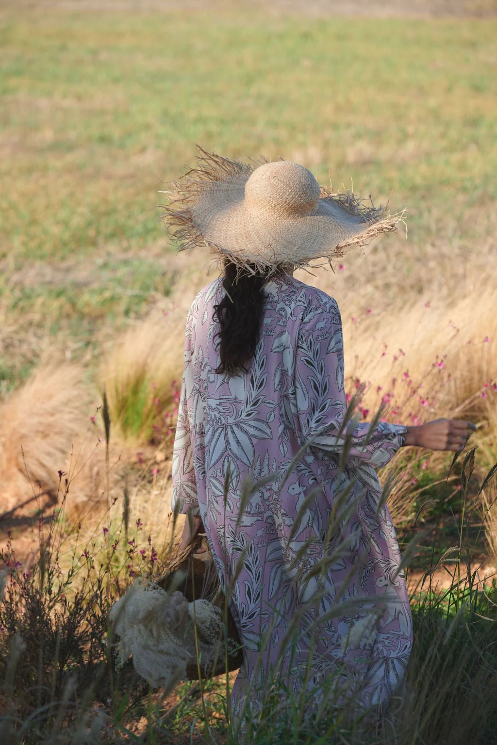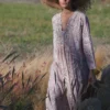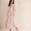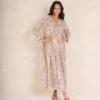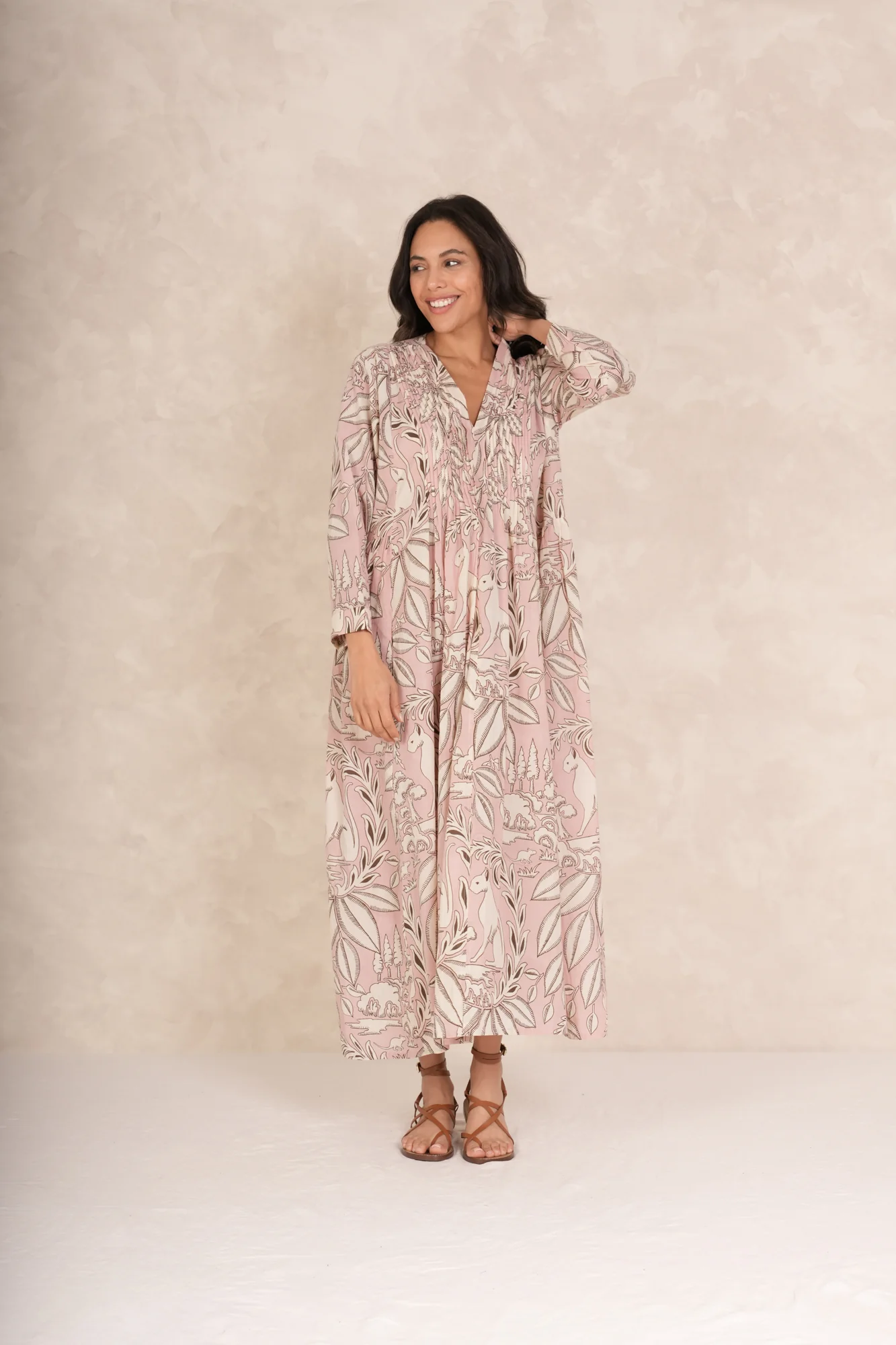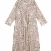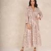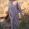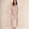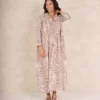 With its delicately pleated placket top leading down to a flowing maxi skirt, this dress showcases the entire One Hundred Stars signature print.