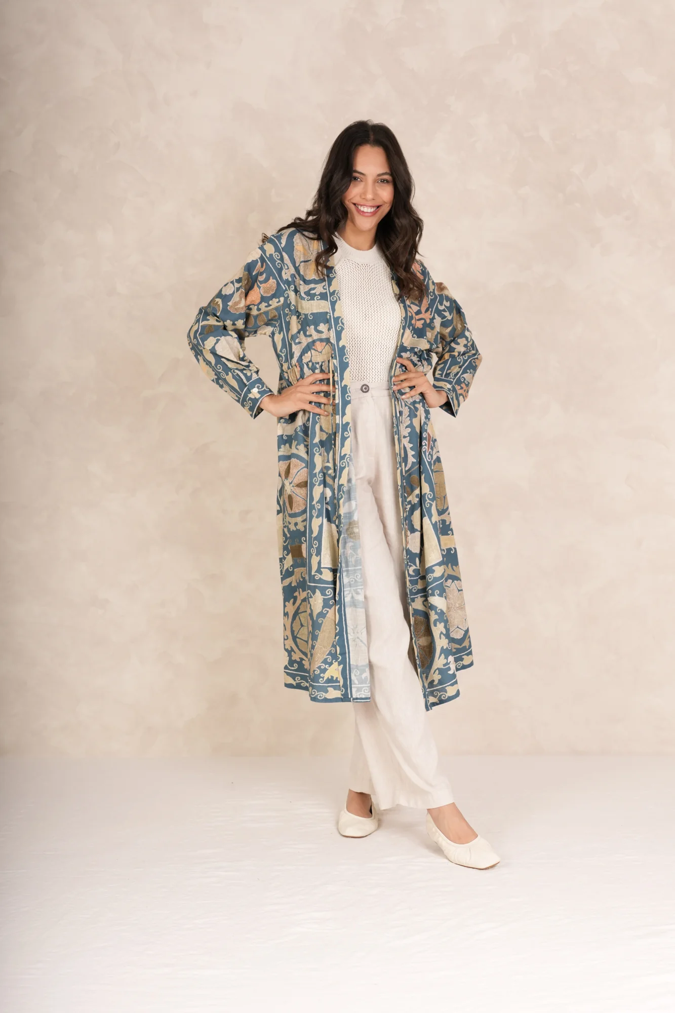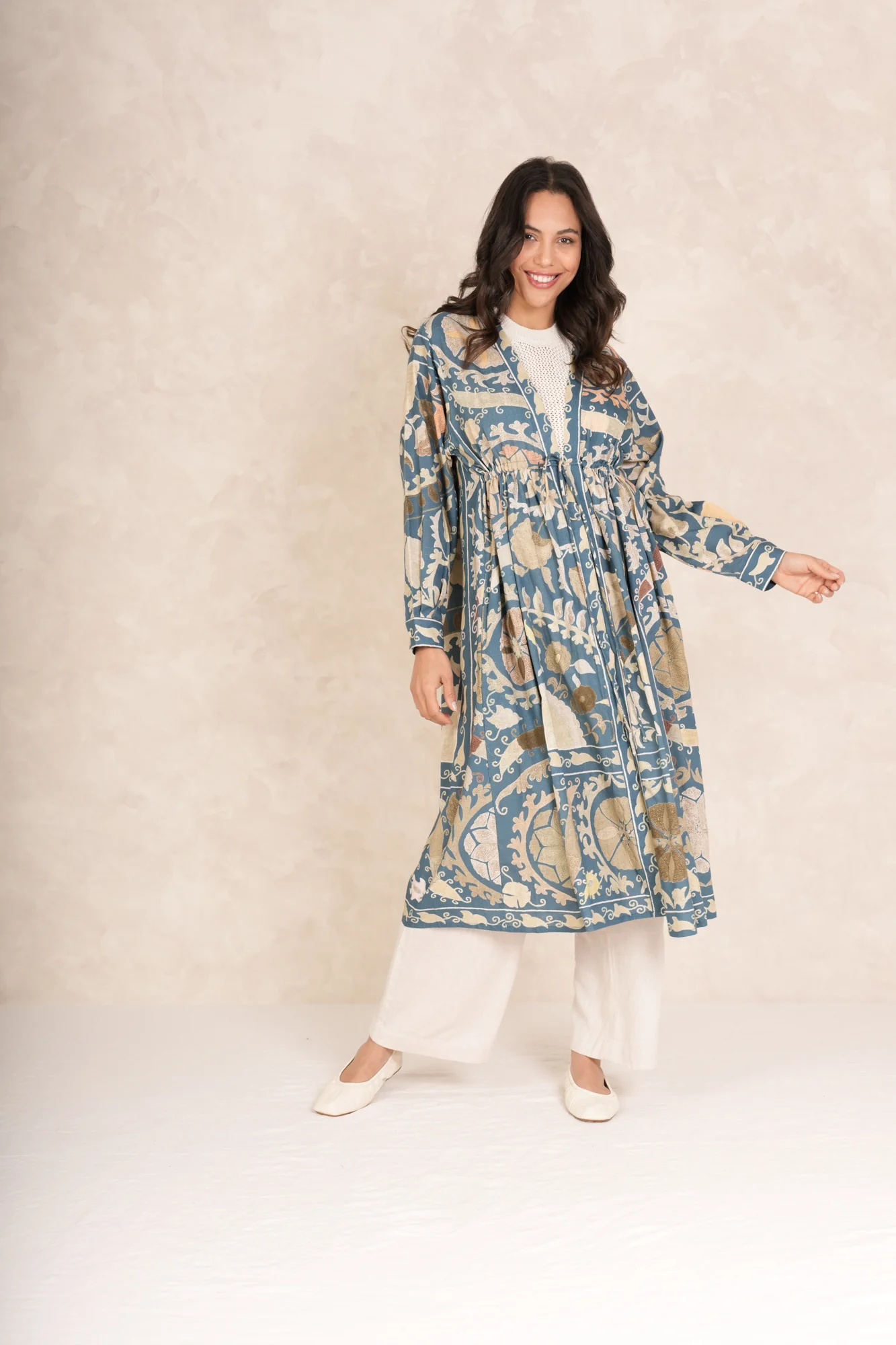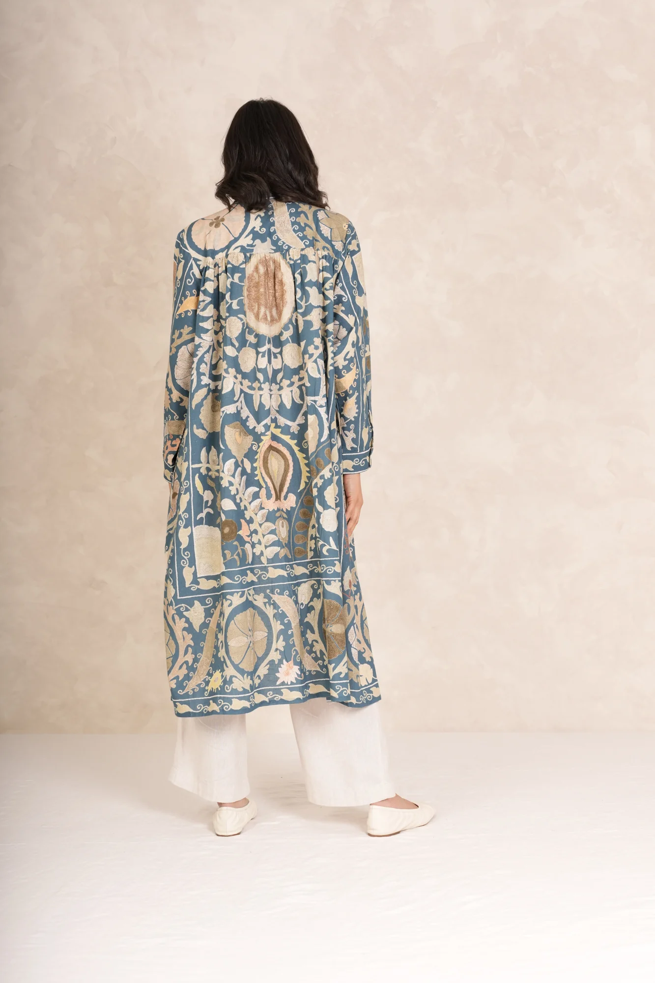 A bold oversized pattern inspired by traditional Susani needlework throws originating from East Asia made by embroidering a chain stitch pattern to a cloth base.