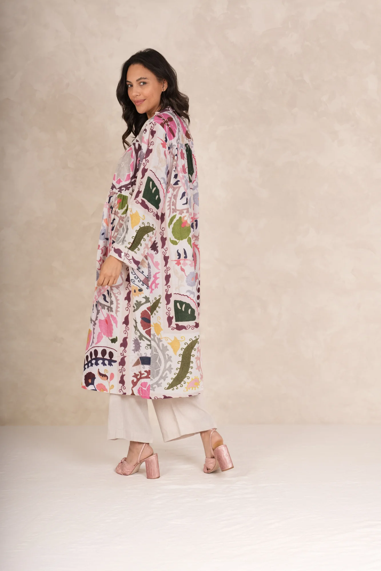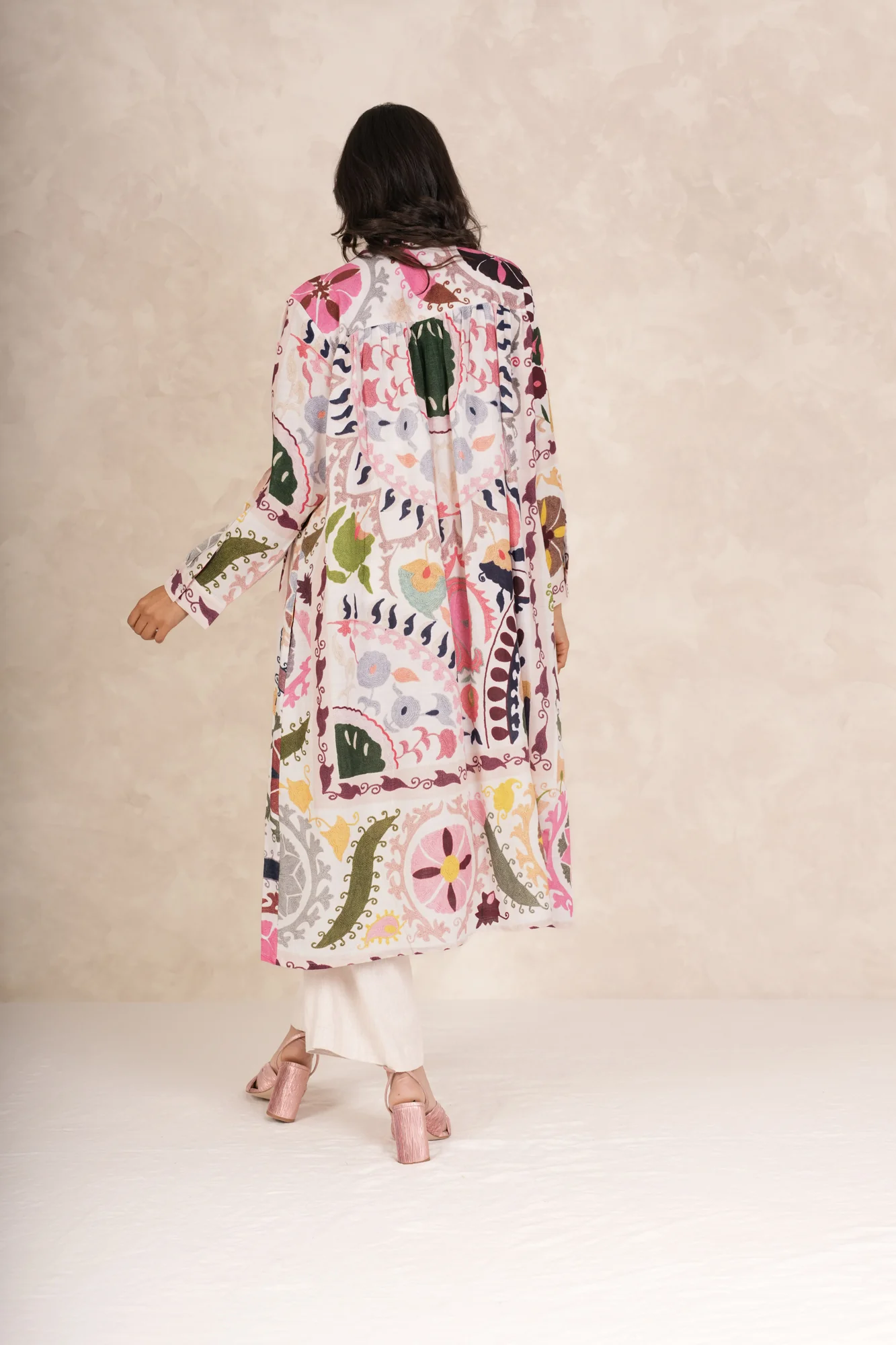 A bold oversized pattern inspired by traditional Susani needlework throws originating from East Asia made by embroidering a chain stitch pattern to a cloth base.