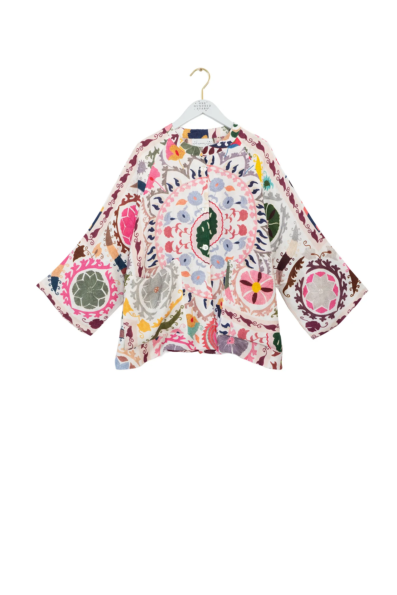 A bold oversized pattern inspired by traditional Susani needlework throws originating from East Asia made by embroidering a chain stitch pattern to a cloth base.
