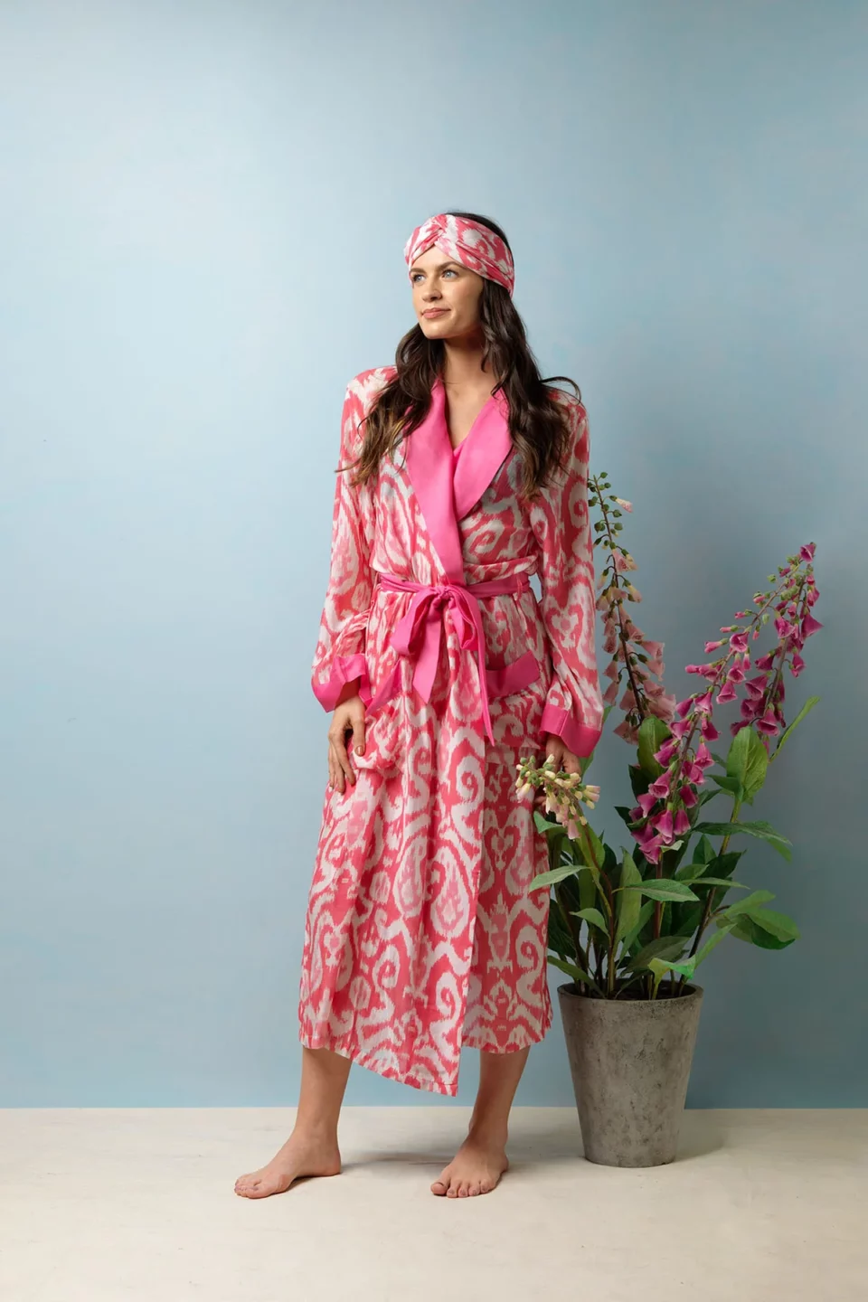 This delicate ensemble of pinks provides this piece with an incredible depth and dimension that makes it truly stand out. The traditional ikat fabric has been given a modern twist to create a singularly stunning look. Perfect for the summer season and high summer holidays!