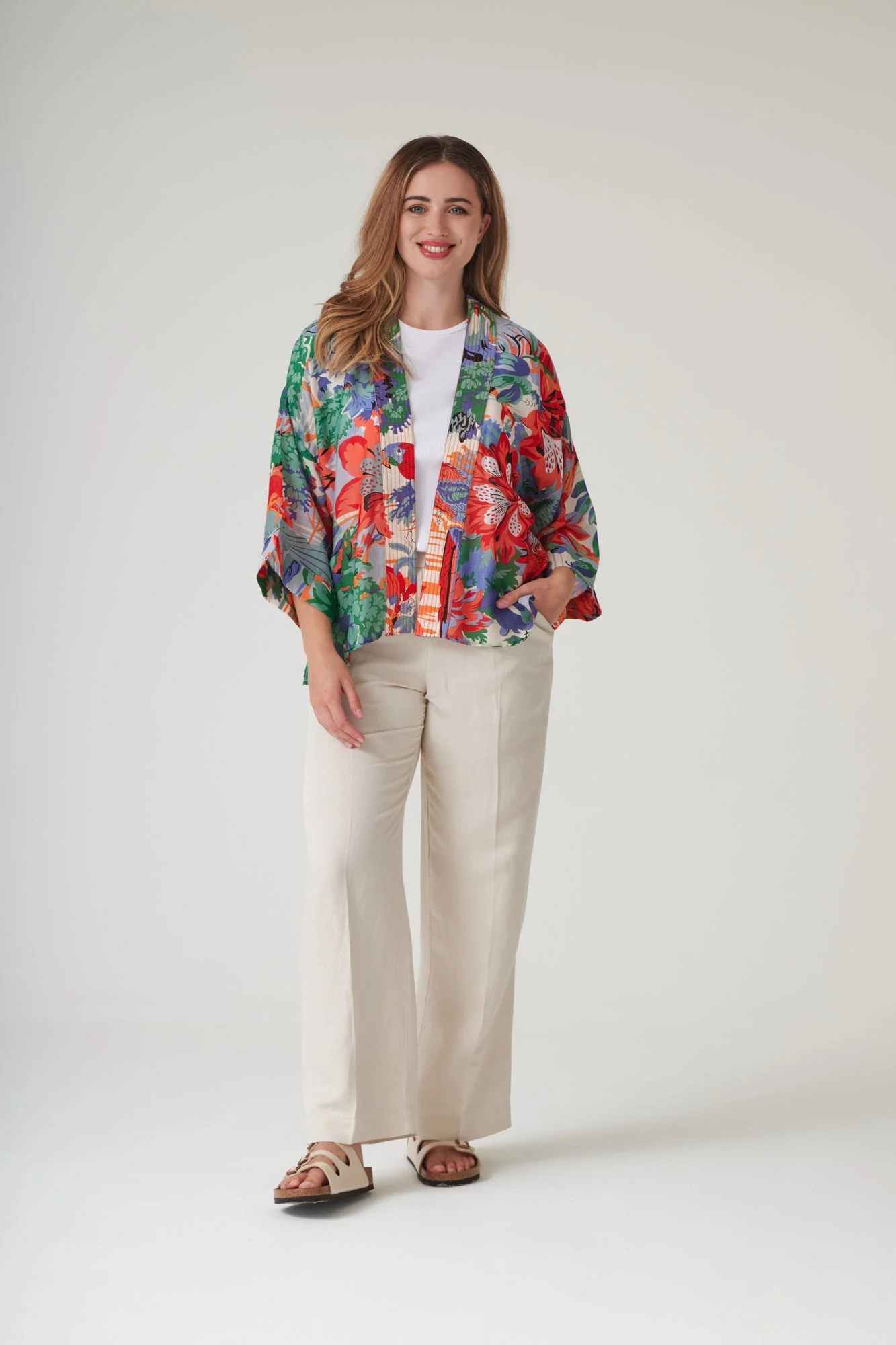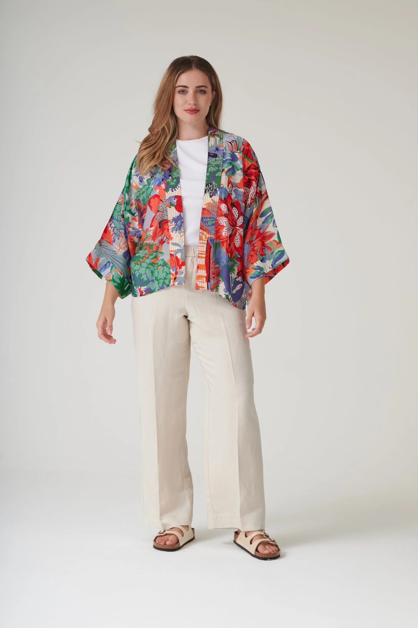 Our bestselling kimono jackets have loose ¾ length sleeves, an open front and a lightly embroidered lapel. Pair with a matching camisole and your favourite jeans in summer or layer over a polo neck during the cooler months.