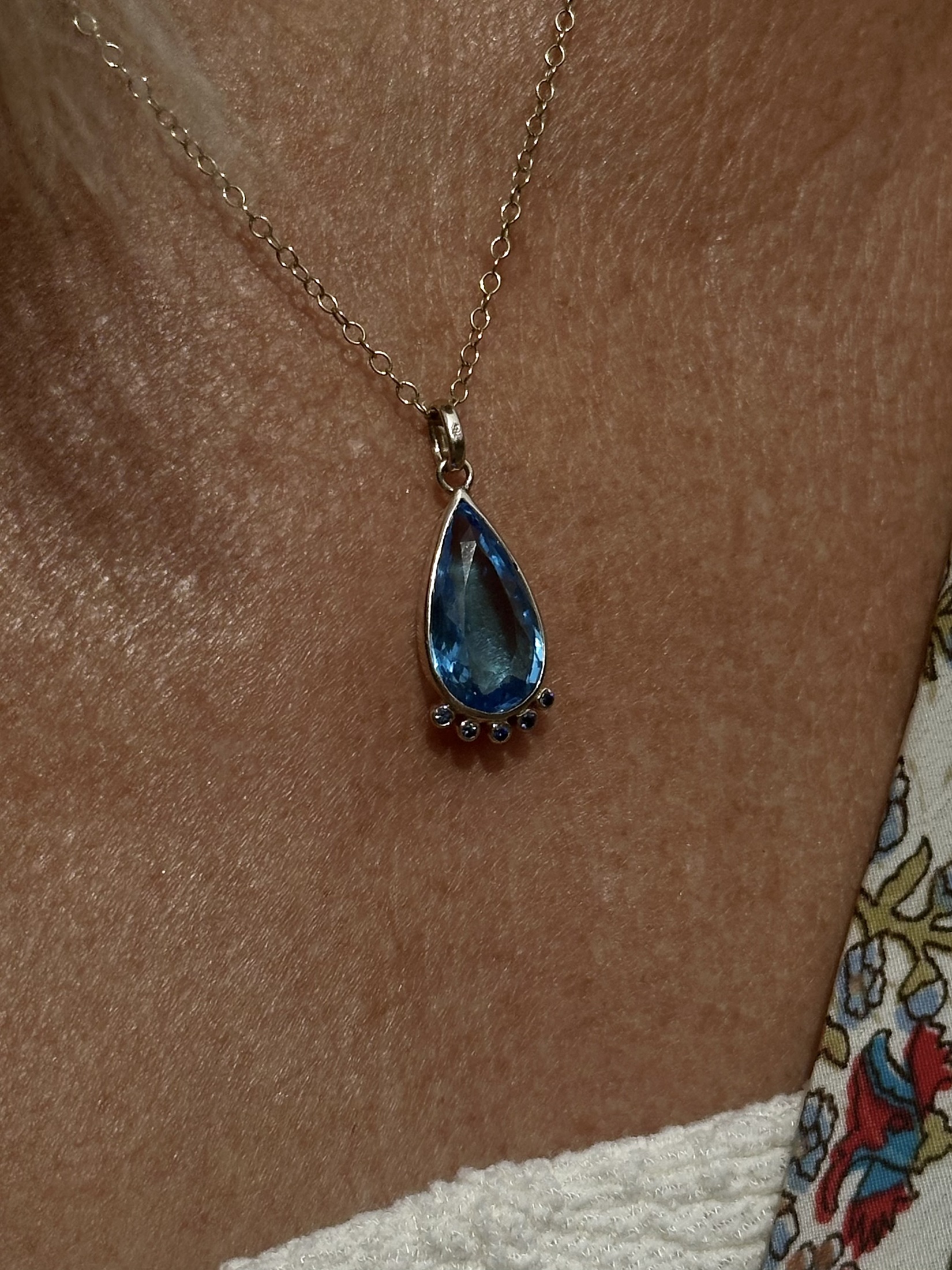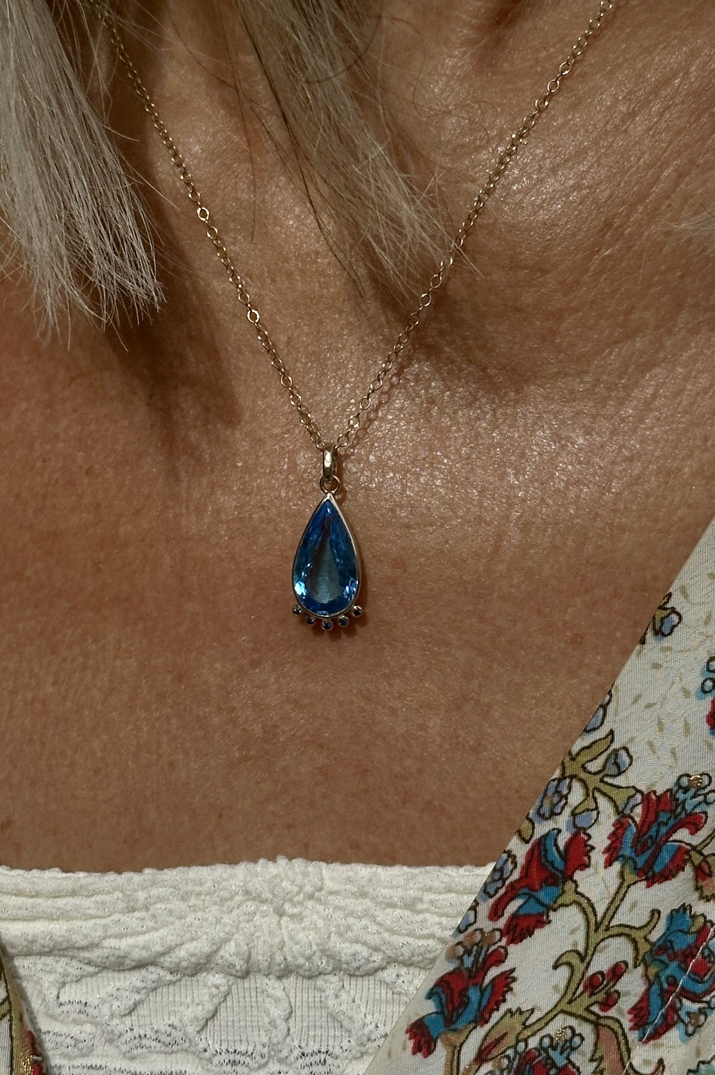 Encased in warm 9ct gold, this exceptional gem is gracefully complemented by five sparkling sapphires, each carefully set at the base of the pendant to enhance its radiance. The complementary hues between the blue topaz and brilliant sapphires create a refined balance, ensuring it catches the eye from every angle.