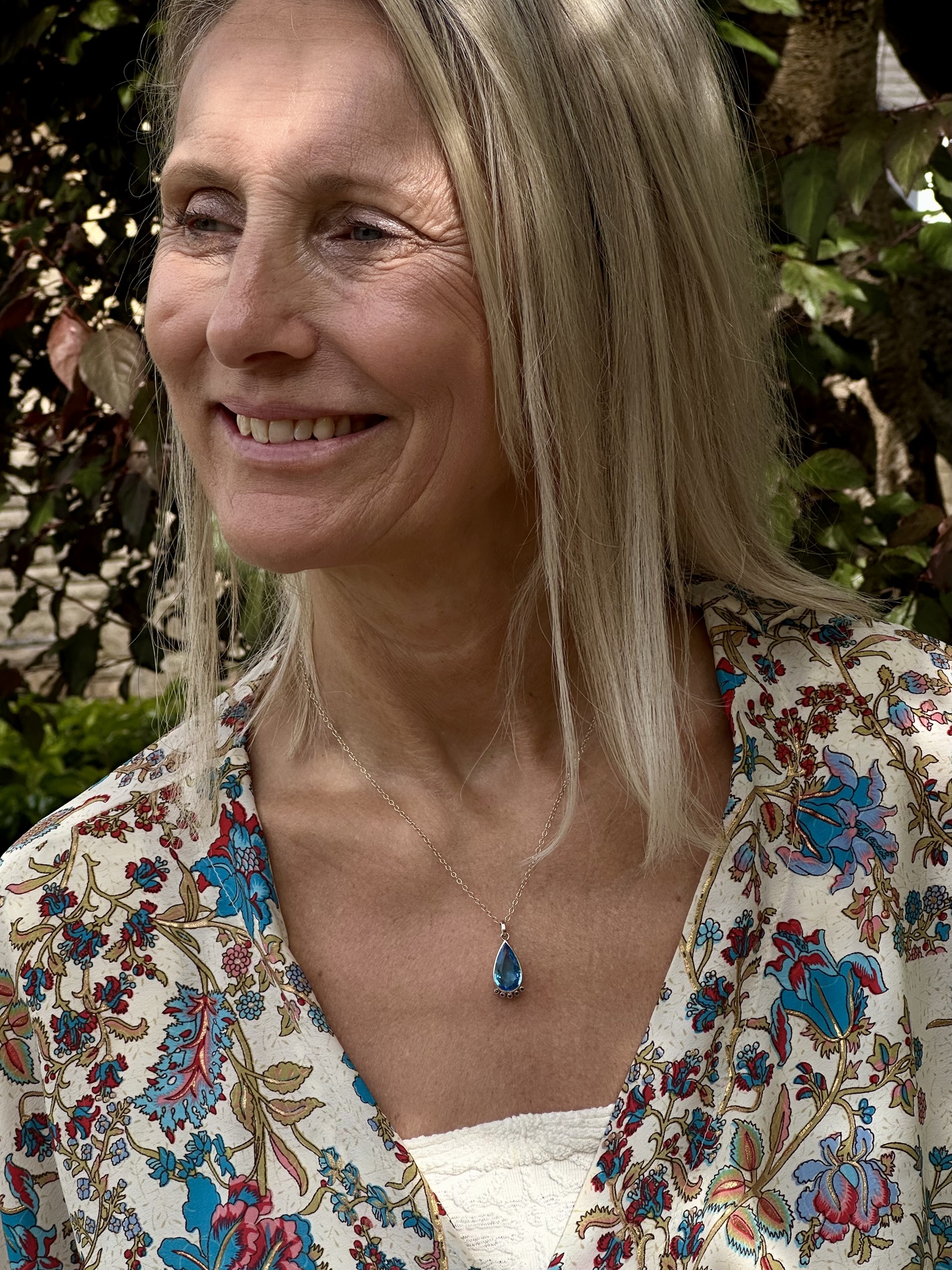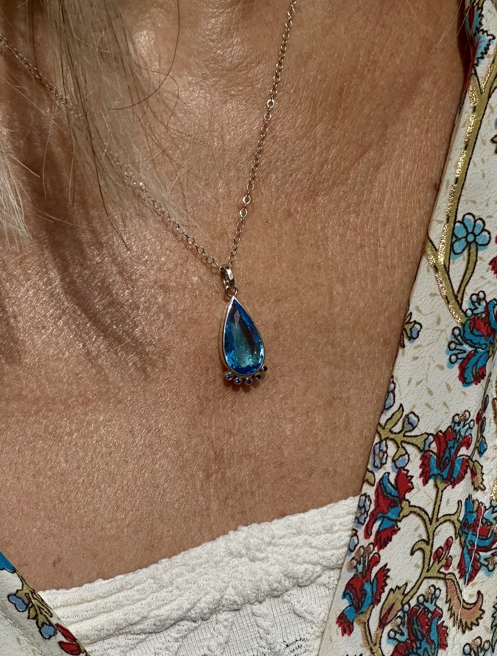 Make a statement with this stunning, handcrafted teardrop pendant, designed to celebrate the raw beauty of nature. The centrepiece is a captivating natural blue topaz, its delicate hue enriched by a unique natural inclusion—a reminder of the Earth’s brilliance and the stone’s genuine origin.