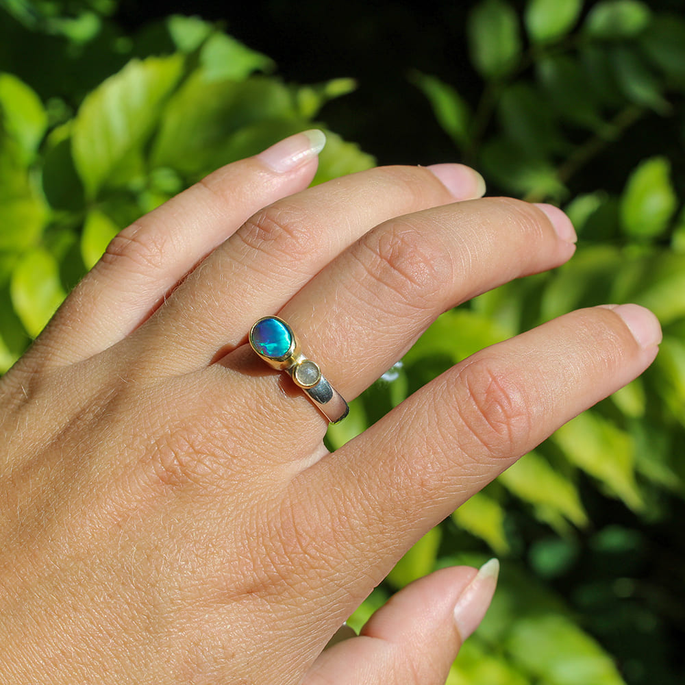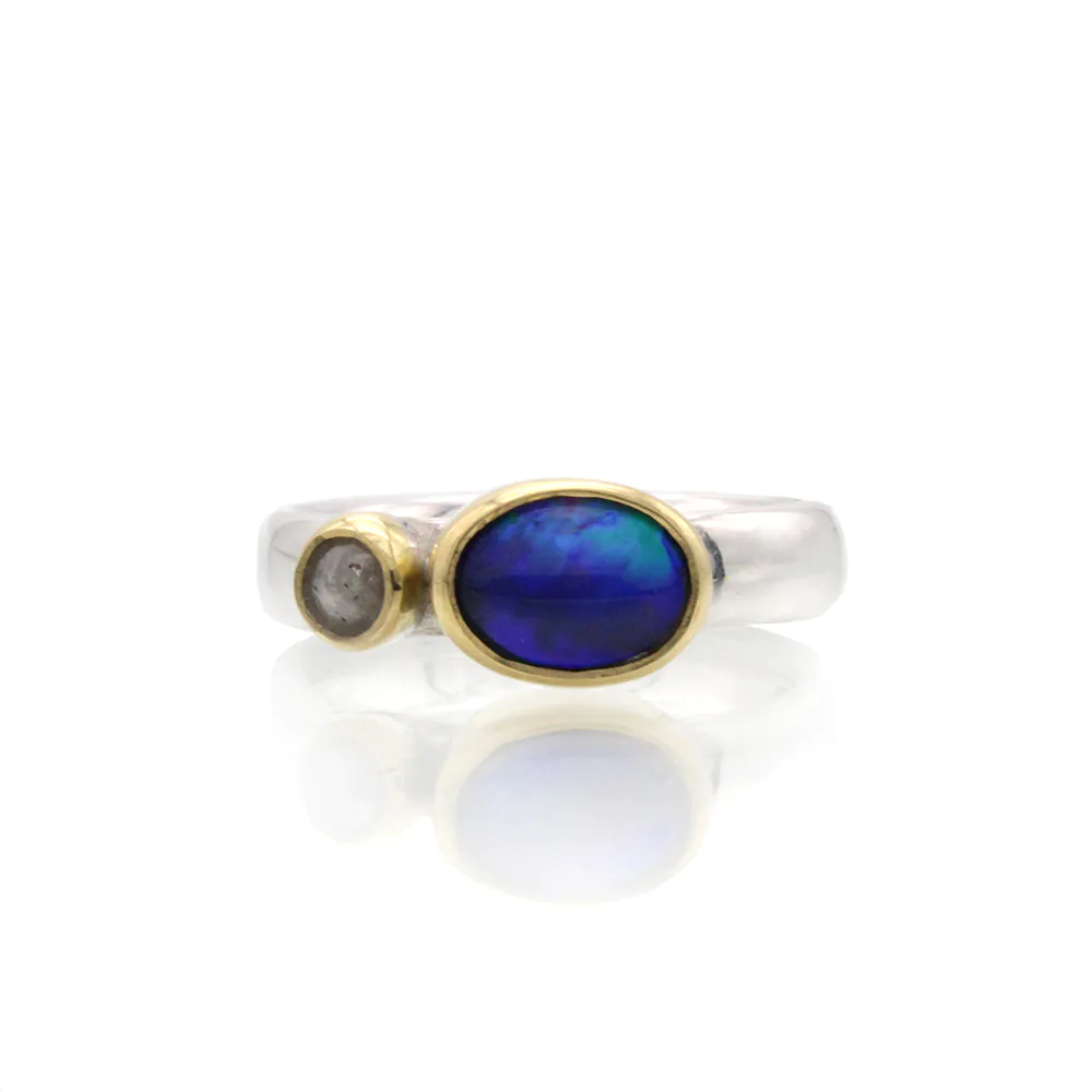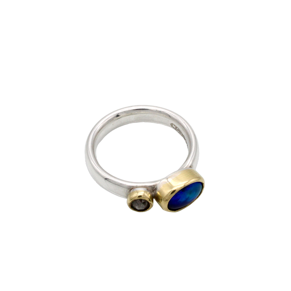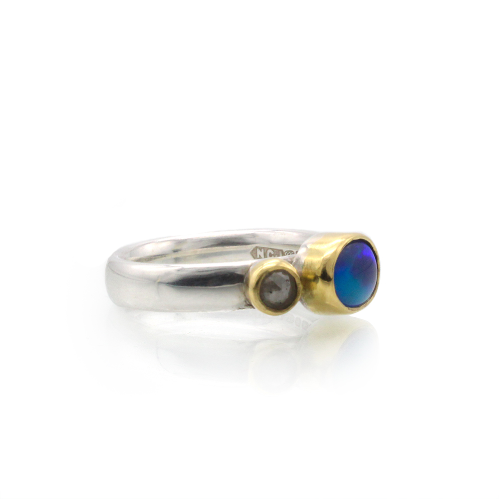 Artisan ring handmade in the UK. This ring features a large rounded Australian opal and a smaller natural diamond. Both gemstones are bezel set in solid 18ct gold, and set upon a smooth sterling silver ring. Please note we only have one in stock.