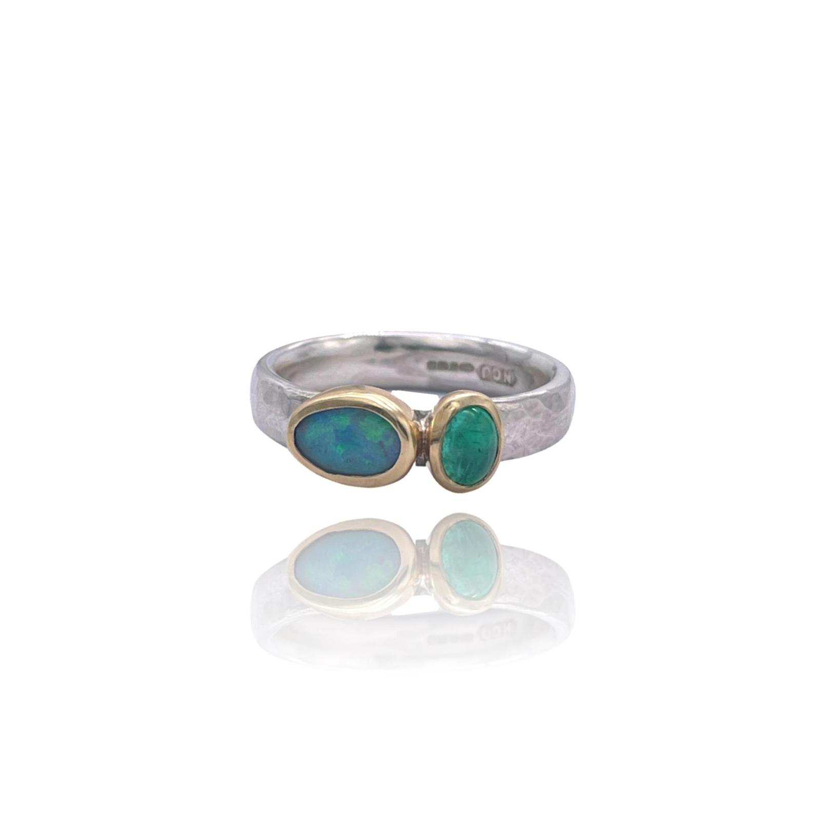 A truly beautiful one off ring, featuring an opal sitting alongside an emerald, both stones are cabochon cut oval shaped. The beauty in this ring is in the creation and thought that went into it by this Female British Designer , she has set the opal lengthways across the band and to compliment it the emerald is set vertically, the blues and greens in the opal enhance and add to the green of the emerald, this ring will take you to any occasion and will be handed down for generations to come, how exciting to purchase and own a ring like this. (Cleopatra loved emeralds and was know to adorn herself them) Treat yourself or buy for a loved one for a special occasion or just because they love it.