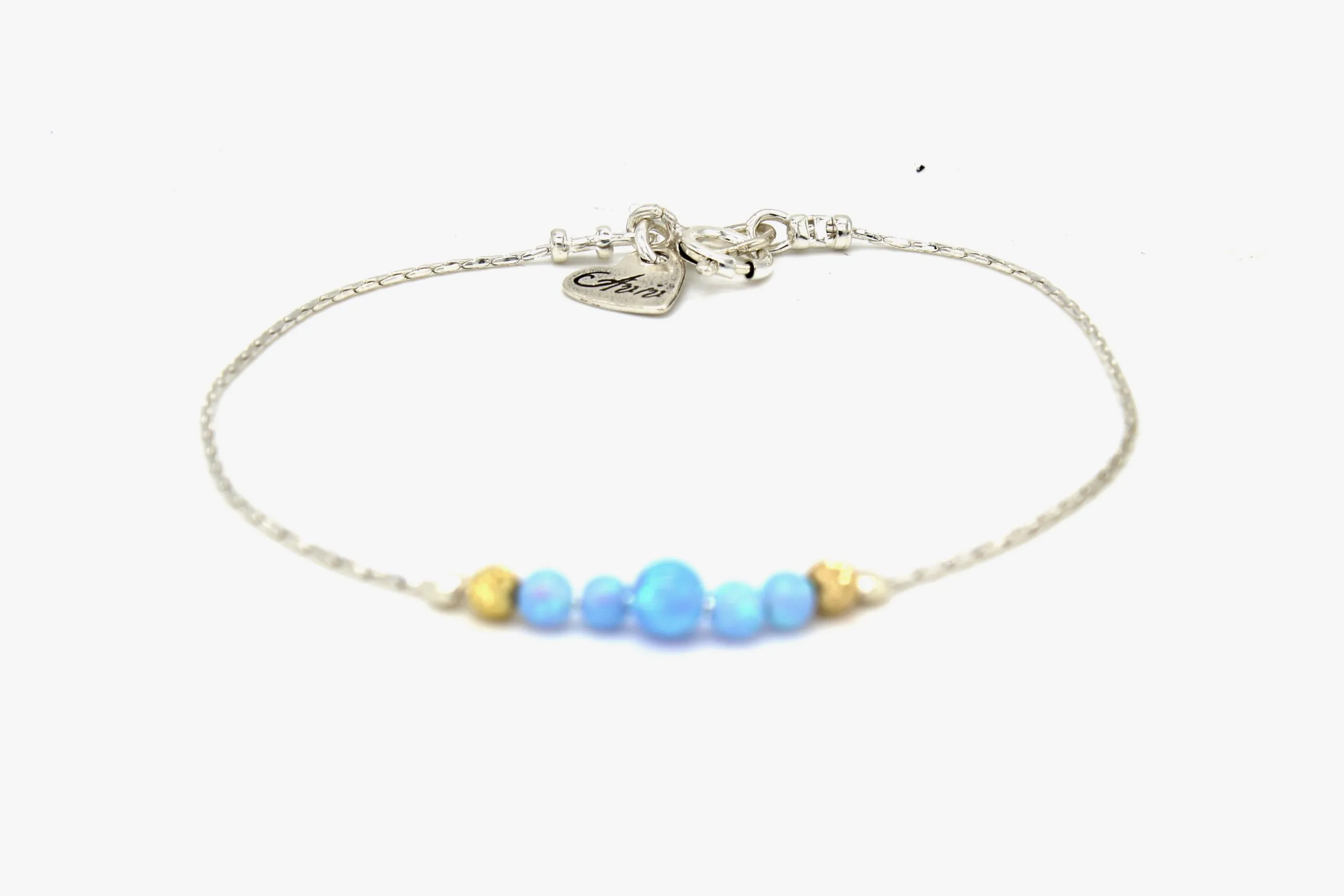 This delicate bracelet features five sweet iridescent opalites framed by two sparkly and textured gold beads.
