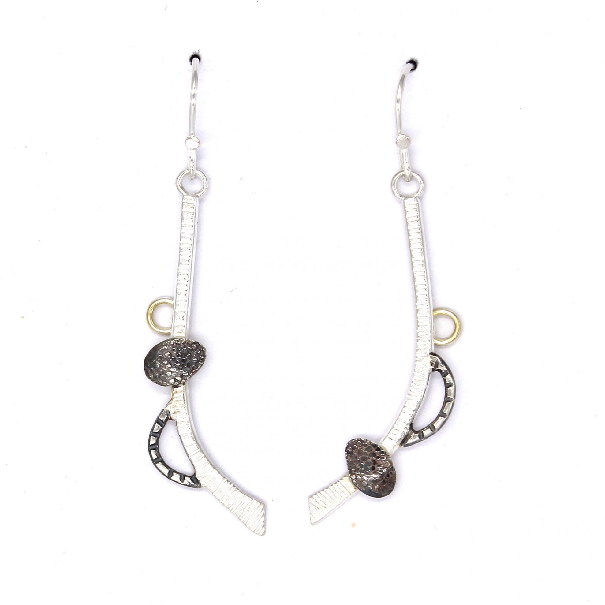 A pair of quirky and handmade multi-tone drop earrings featuring differently textured metallic tones, of silver, oxidised silver and 18ct gold, and flowing detailed side pieces that give an organic feel to the piece.