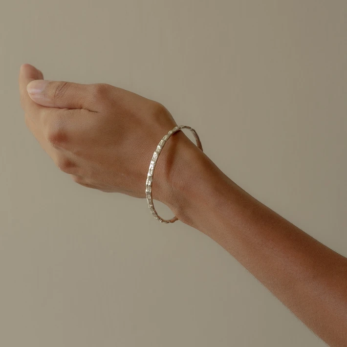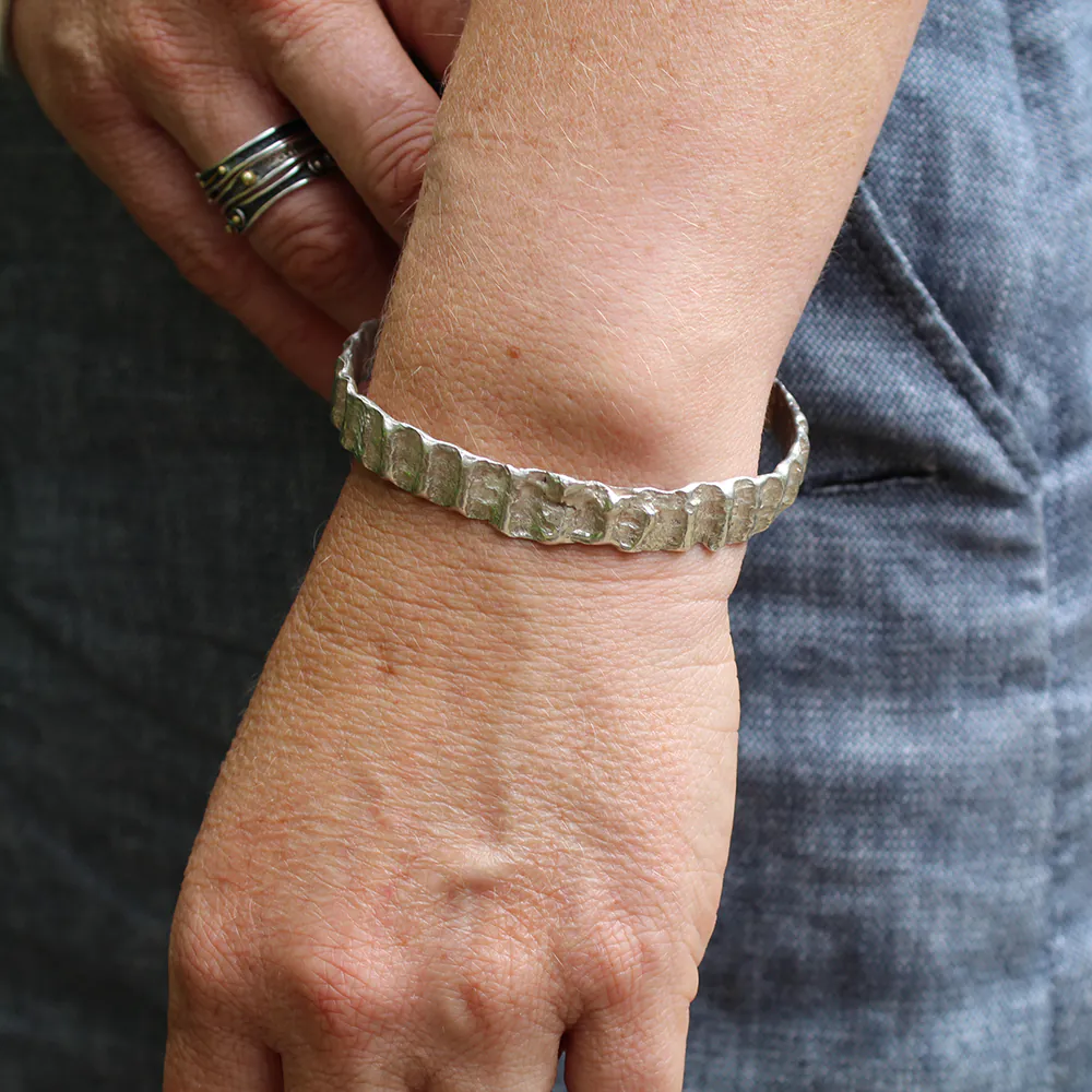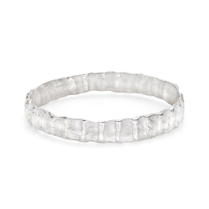 This stunning British handmade organic bangle has been created from silver. Its substantial weight and wavy, tactile design make a fabulous statement piece, inspired by the cockles on the coast of Cornwall.