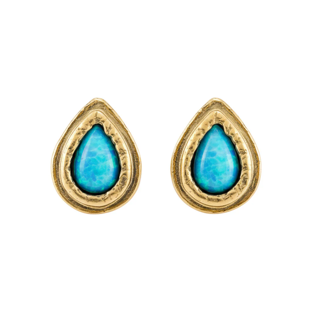 Teardrop Opalite gold plated silver stud earrings set in an organic setting.