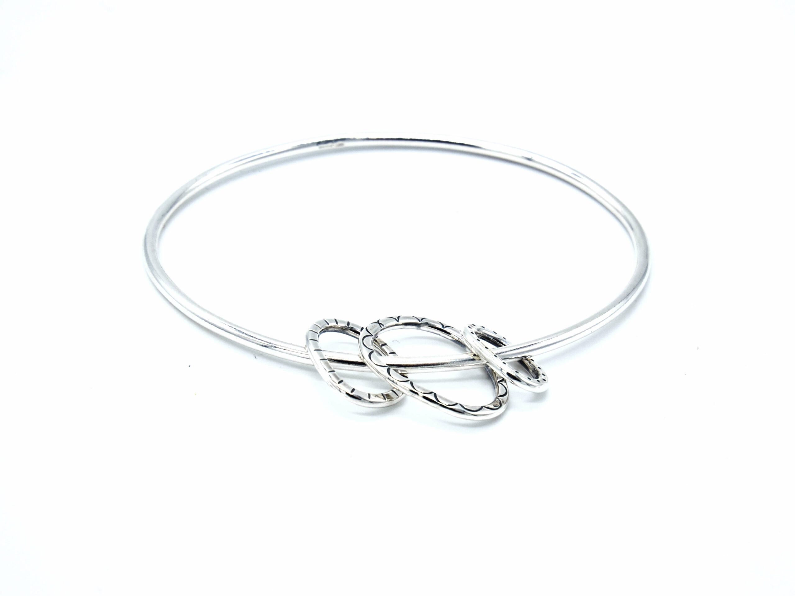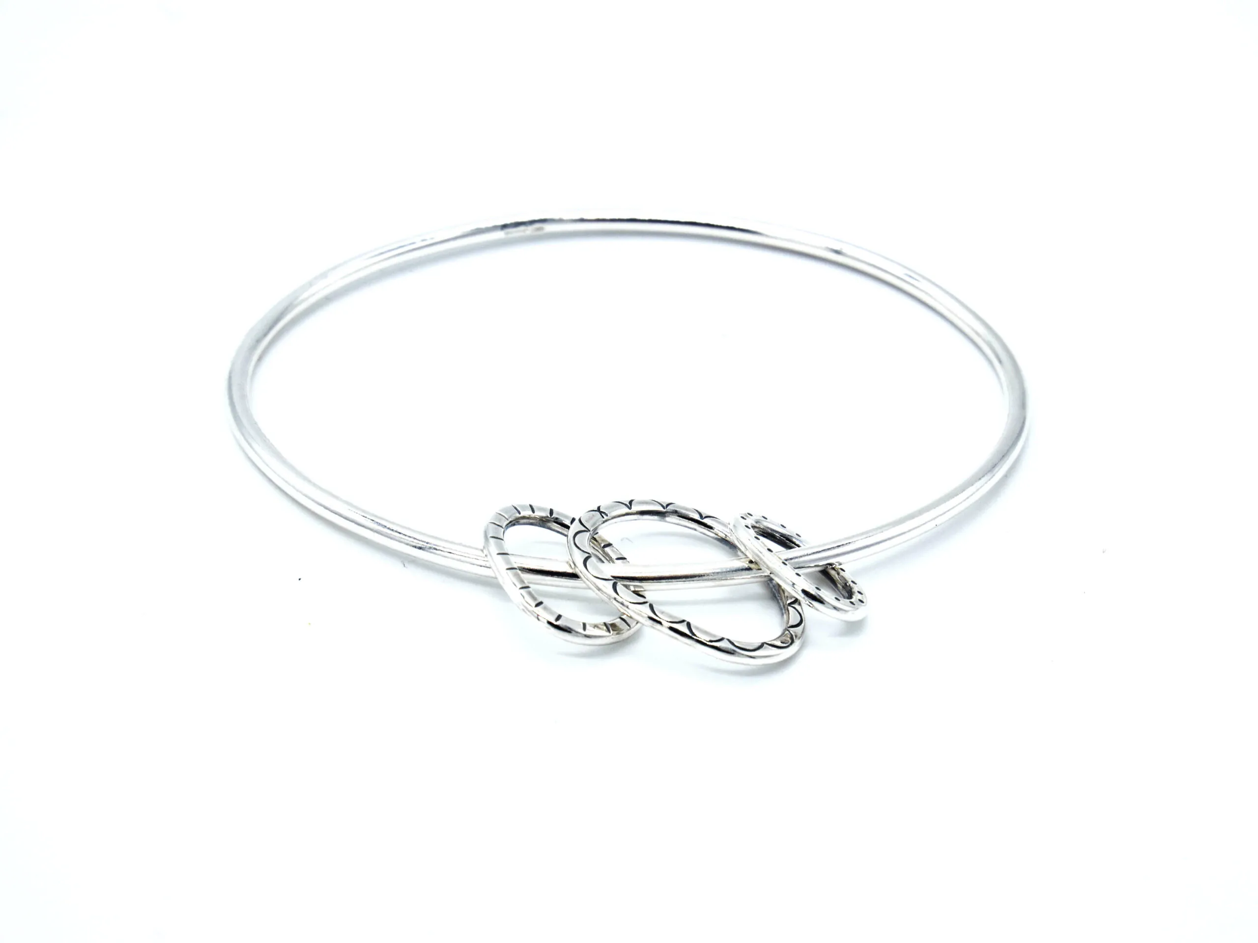 This oval bangle is crafted from sterling silver and has three hoops swinging from it each with their own design, dots, circles or stripes, you could create a set if so desired with the matching three hoop necklace or  the striped or dotty studs. A fab addition to any collection.